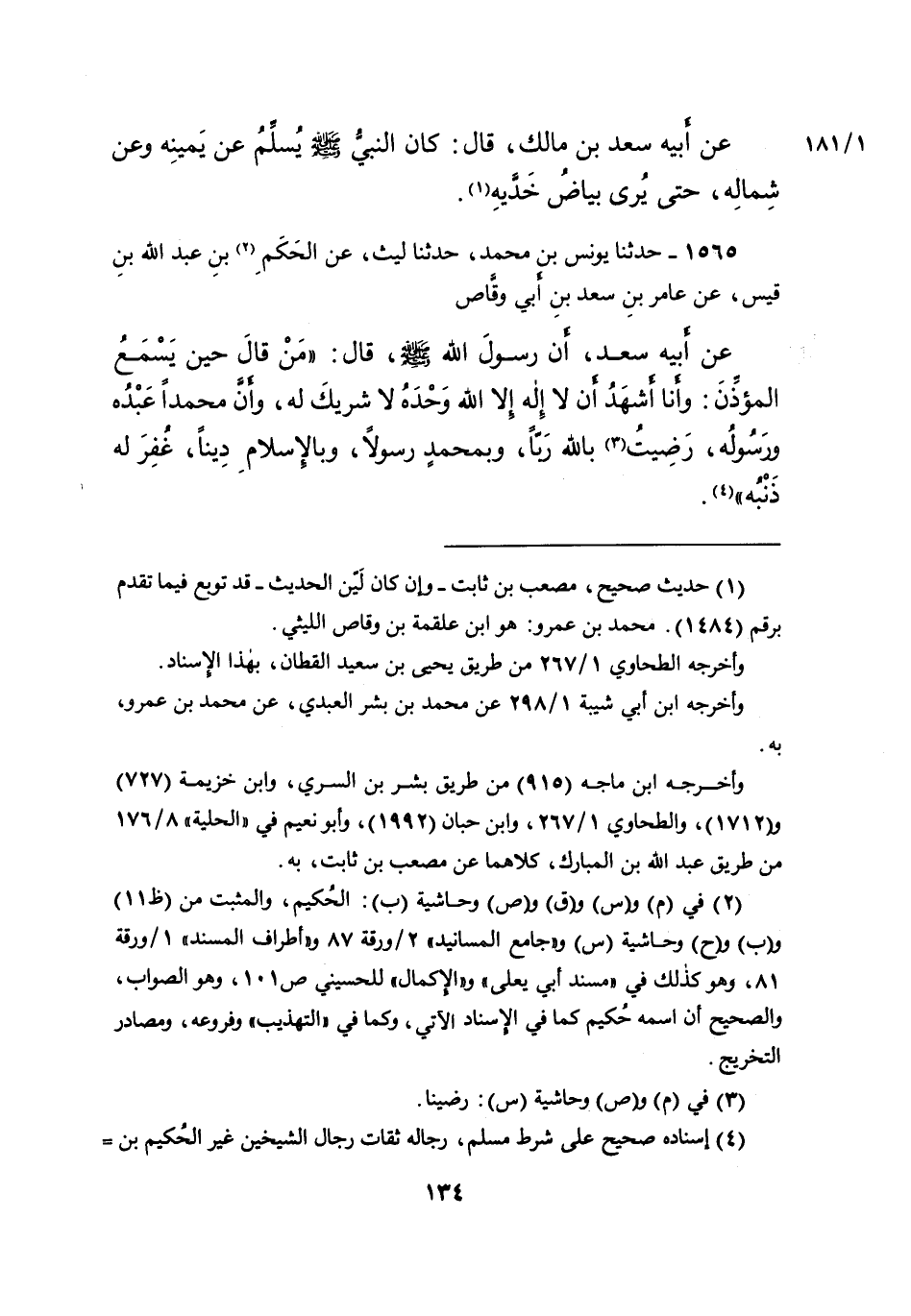 ١٥٦٥ - حَدَّثَنَا يُونُسُ بْنُ مُحَمَّدٍ، حَدَّثَنَا لَيْثٌ، عَنِ الْحَكَمِ (٢) بْنِ عَبْدِ اللهِ بْنِ قَيْسٍ، عَنْ عَامِرِ بْنِ سَعْدِ بْنِ أَبِي وَقَّاصٍ، عَنْ أَبِيهِ سَعْدٍ: أَنَّ رَسُولَ اللهِ صَلَّى اللهُ عَلَيْهِ وَسَلَّمَ قَالَ: " مَنْ قَالَ حِينَ يَسْمَعُ الْمُؤَذِّنَ: وَأَنَا أَشْهَدُ أَنْ لَا إِلَهَ إِلا اللهُ، وَحْدَهُ لَا شَرِيكَ لَهُ، وَأَنَّ مُحَمَّدًا عَبْدُهُ وَرَسُولُهُ، رَضِيتُ (٣) بِاللهِ رَبًّا وَبِمُحَمَّدٍ رَسُولًا، وَبِالْإِسْلامِ دِينًا، غُفِرَ لَهُ ذَنْبُهُ " (٤)