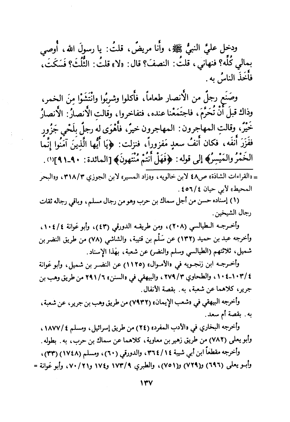 وَدَخَلَ عَلَيَّ النَّبِيُّ صَلَّى اللهُ عَلَيْهِ وَسَلَّمَ وَأَنَا مَرِيضٌ، قُلْتُ: يَا رَسُولَ اللهِ أُوصِي بِمَالِي كُلِّهِ؟ فَنَهَانِي. قُلْتُ: النِّصْفُ؟ قَالَ: " لَا " قُلْتُ: الثُّلُثُ؟ فَسَكَتَ. فَأَخَذَ النَّاسُ بِهِ، وَصَنَعَ رَجُلٌ مِنَ الْأَنْصَارِ طَعَامًا، فَأَكَلُوا وَشَرِبُوا وَانْتَشَوْا مِنَ الخَمْرِ، وَذَاكَ قَبْلَ أَنْ تُحَرَّمَ، فَاجْتَمَعْنَا عِنْدَهُ فَتَفَاخَرُوا، وَقَالَتِ الْأَنْصَارُ: الْأَنْصَارُ خَيْرٌ، وَقَالَتِ الْمُهَاجِرُونَ: الْمُهَاجِرُونَ خَيْرٌ. فَأَهْوَى لَهُ رَجُلٌ بِلَحْيِ جَزُورٍ، فَفَزَرَ أَنْفَهُ، فَكَانَ أَنْفُ سَعْدٍ مَفْزُورًا، فَنَزَلَتْ: {يَا أَيُّهَا الَّذِينَ آمَنُوا إِنَّمَا الْخَمْرُ وَالْمَيْسِرُ} إِلَى قَوْلِهِ {فَهَلْ أَنْتُمْ مُنْتَهُونَ} [المائدة: ٩٠-٩١] (١)