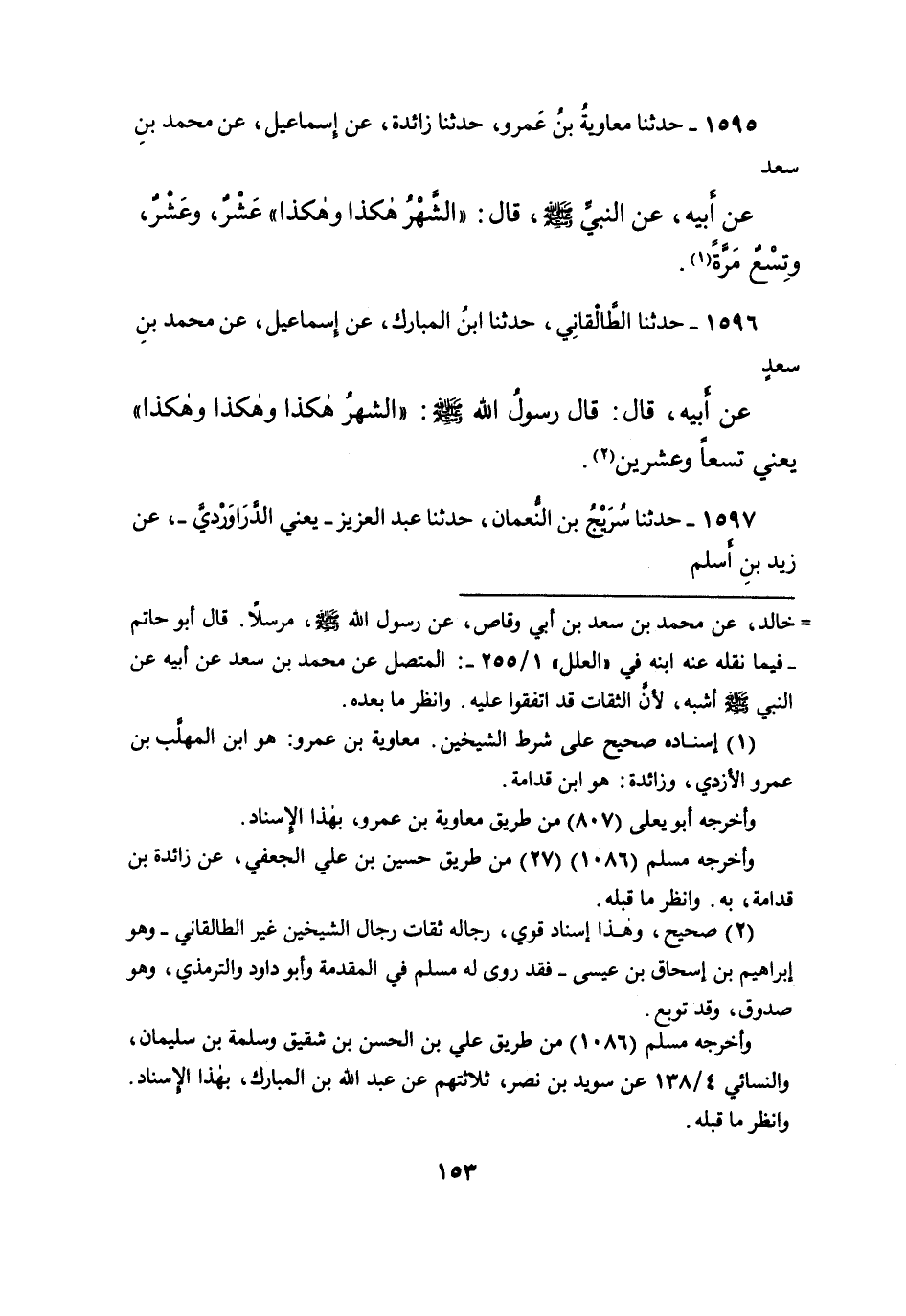 ١٥٩٥ - حَدَّثَنَا مُعَاوِيَةُ بْنُ عَمْرٍو، حَدَّثَنَا زَائِدَةُ، عَنْ إِسْمَاعِيلَ، عَنْ مُحَمَّدِ بْنِ سَعْدٍ، عَنْ أَبِيهِ، عَنِ النَّبِيِّ صَلَّى اللهُ عَلَيْهِ وَسَلَّمَ، قَالَ: " الشَّهْرُ هَكَذَا وَهَكَذَا عَشْرٌ وَعَشْرٌ، وَتِسْعٌ مَرَّةً " (١)