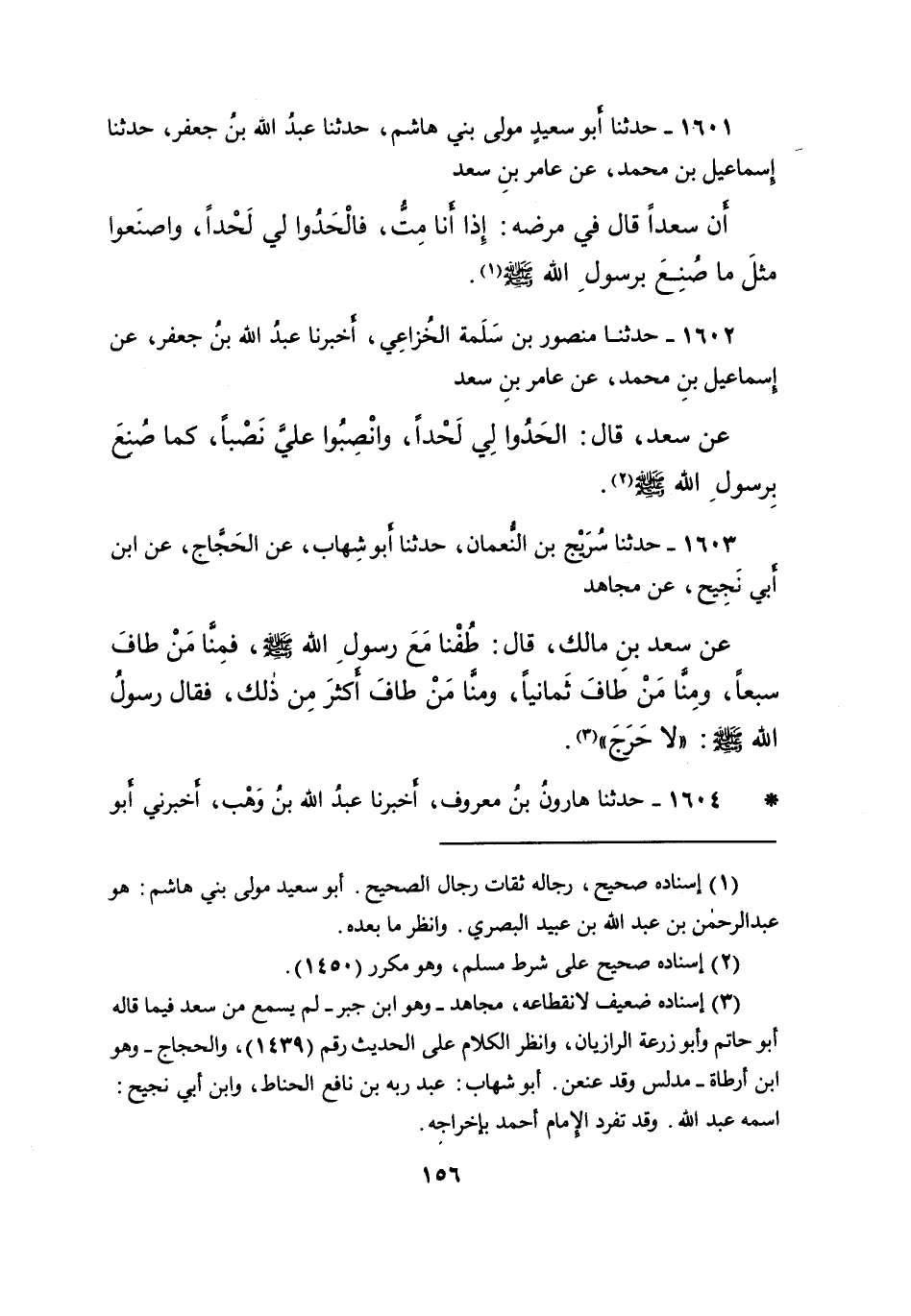 ١٦٠٣ - حَدَّثَنَا سُرَيْجُ بْنُ النُّعْمَانِ، حَدَّثَنَا أَبُو شِهَابٍ، عَنِ الْحَجَّاجِ، عَنِ ابْنِ أَبِي نَجِيحٍ، عَنْ مُجَاهِدٍ، عَنْ سَعْدِ بْنِ مَالِكٍ، قَالَ: طُفْنَا مَعَ رَسُولِ اللهِ صَلَّى اللهُ عَلَيْهِ وَسَلَّمَ، فَمِنَّا مَنْ طَافَ سَبْعًا، وَمِنَّا مَنْ طَافَ ثَمَانِيًا، وَمِنَّا مَنْ طَافَ أَكْثَرَ مِنْ ذَلِكَ، فَقَالَ رَسُولُ اللهِ صَلَّى اللهُ عَلَيْهِ وَسَلَّمَ: " لَا حَرَجَ " (٣)