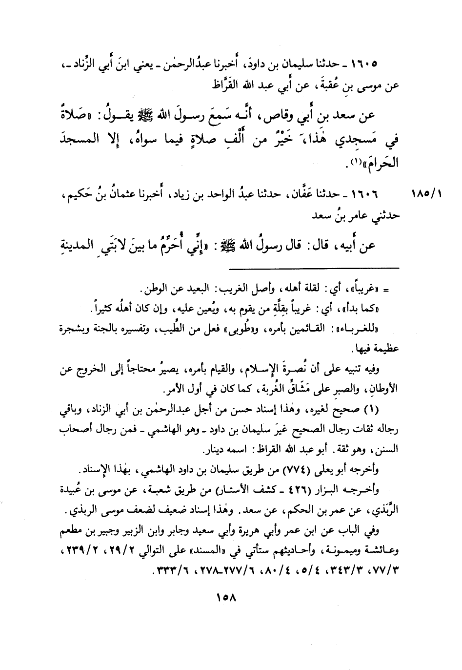 ١٦٠٥ - حَدَّثَنَا سُلَيْمَانُ بْنُ دَاوُدَ، أَخْبَرَنَا عَبْدُ الرَّحْمَنِ يَعْنِي ابْنَ أَبِي الزِّنَادِ، عَنْ مُوسَى بْنِ عُقْبَةَ، عَنْ أَبِي عَبْدِ اللهِ الْقَرَّاظِ، عَنْ سَعْدِ بْنِ أَبِي وَقَّاصٍ، أَنَّهُ سَمِعَ رَسُولَ اللهِ صَلَّى اللهُ عَلَيْهِ وَسَلَّمَ يَقُولُ: " صَلاةٌ فِي مَسْجِدِي هَذَا خَيْرٌ مِنَ ألفِ صَلاةٍ فِيمَا سِوَاهُ، إِلا الْمَسْجِدَ الْحَرَامَ " (١)