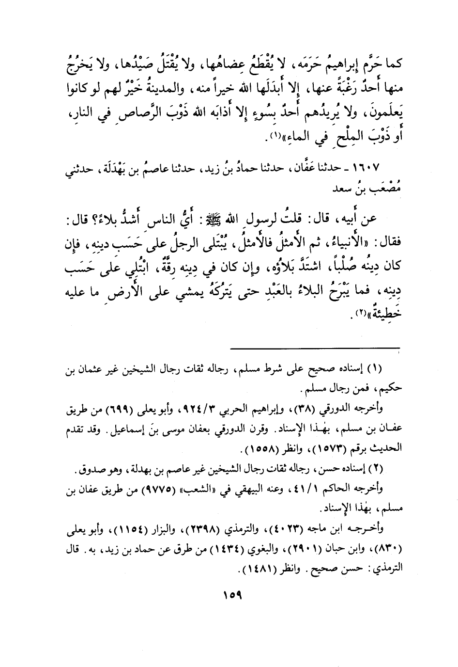 ١٦٠٧ - حَدَّثَنَا عَفَّانُ، حَدَّثَنَا حَمَّادُ بْنُ زَيْدٍ، حَدَّثَنَا عَاصِمُ بْنُ بَهْدَلَةَ، حَدَّثَنِي مُصْعَبُ بْنُ سَعْدٍ، عَنْ أَبِيهِ قَالَ: قُلْتُ لِرَسُولِ اللهِ صَلَّى اللهُ عَلَيْهِ وَسَلَّمَ: أَيُّ النَّاسِ أَشَدُّ بَلاءً؟ قَالَ: فَقَالَ: " الْأَنْبِيَاءُ، ثُمَّ الْأَمْثَلُ، فَالْأَمْثَلُ، يُبْتَلَى الرَّجُلُ عَلَى حَسَبِ دِينِهِ، فَإِنْ كَانَ دِينُهُ صُلْبًا اشْتَدَّ بَلاؤُهُ، وَإِنْ كَانَ فِي دِينِهِ رِقَّةٌ ابْتُلِيَ عَلَى حَسَبِ دِينِهِ، فَمَا يَبْرَحُ الْبَلاءُ بِالْعَبْدِ حَتَّى يَتْرُكَهُ يَمْشِي عَلَى الْأَرْضِ مَا عَلَيْهِ خَطِيئَةٌ " (٢)
