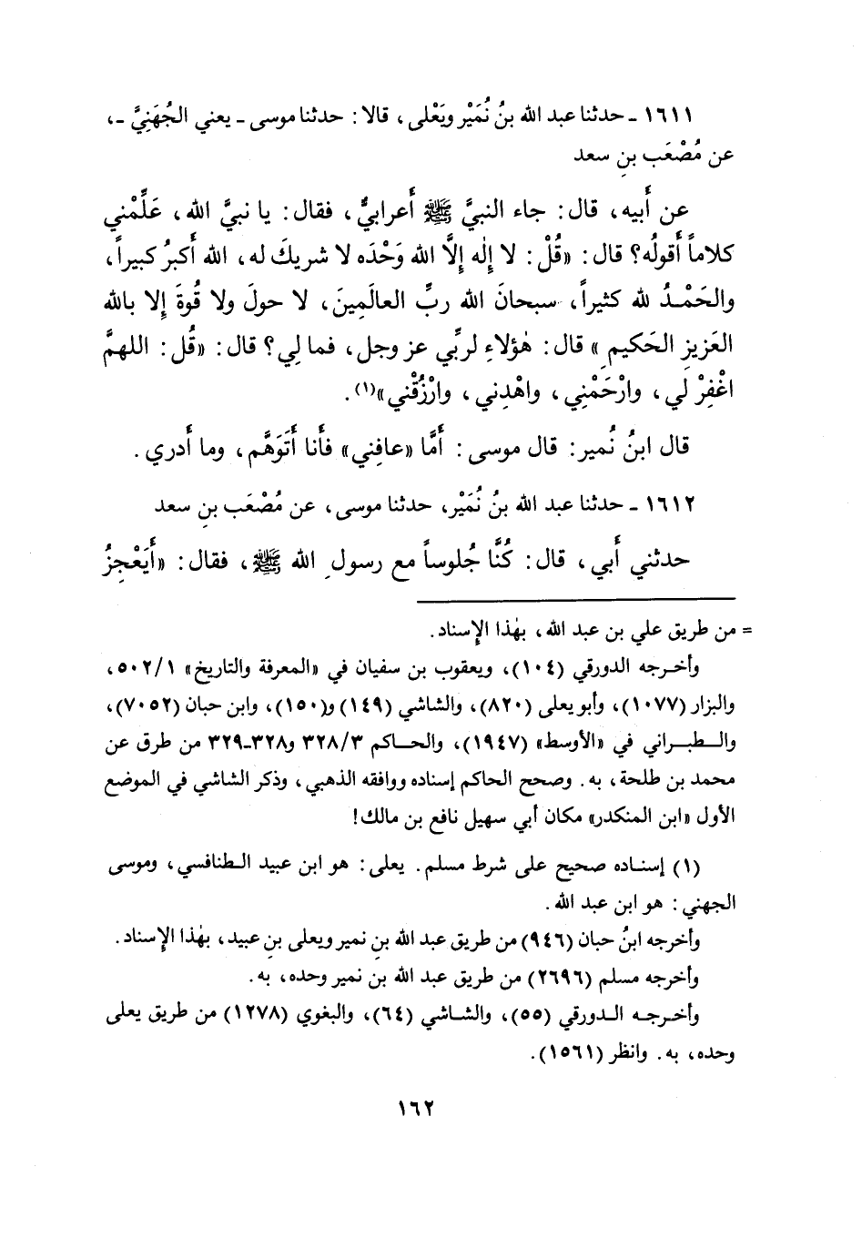 ١٦١١ - حَدَّثَنَا عَبْدُ اللهِ بْنُ نُمَيْرٍ، وَيَعْلَى، قَالا: حَدَّثَنَا مُوسَى يَعْنِي الْجُهَنِيَّ، عَنْ مُصْعَبِ بْنِ سَعْدٍ، عَنْ أَبِيهِ، قَالَ: جَاءَ النَّبِيَّ صَلَّى اللهُ عَلَيْهِ وَسَلَّمَ أَعْرَابِيٌّ، فَقَالَ: يَا نَبِيَّ اللهِ، عَلِّمْنِي كَلامًا أَقُولُهُ، قَالَ: " قُلْ: لَا إِلَهَ إِلا اللهُ وَحْدَهُ لَا شَرِيكَ لَهُ، اللهُ أَكْبَرُ كَبِيرًا وَالْحَمْدُ لِلَّهِ كَثِيرًا، سُبْحَانَ اللهِ رَبِّ الْعَالَمِينَ، لَا حَوْلَ وَلا قُوَّةَ إِلا بِاللهِ الْعَزِيزِ الْحَكِيمِ " قَالَ: هَؤُلاءِ لِرَبِّي عَزَّ وَجَلَّ، فَمَا لِي؟ قَالَ: قُلْ: " اللهُمَّ اغْفِرْ لِي وَارْحَمْنِي وَاهْدِنِي وَارْزُقْنِي " (١) قَالَ ابْنُ نُمَيْرٍ: قَالَ مُوسَى: أَمَّا " عَافِنِي " فَأَنَا أَتَوَهَّمُ وَمَا أَدْرِي