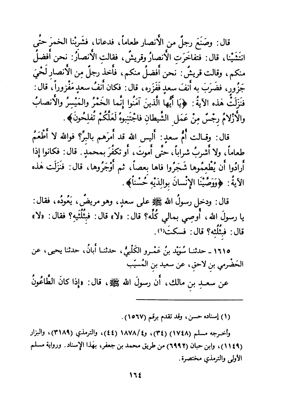 قَالَ: وَصَنَعَ رَجُلٌ مِنَ الْأَنْصَارِ طَعَامًا، فَدَعَانَا فَشَرِبْنَا الْخَمْرَ حَتَّى انْتَشَيْنَا، قَالَ: فَتَفَاخَرَتِ الْأَنْصَارُ، وَقُرَيْشٌ، فَقَالَتِ الْأَنْصَارُ: نَحْنُ أَفْضَلُ مِنْكُمْ، وَقَالَتْ قُرَيْشٌ: نَحْنُ أَفْضَلُ مِنْكُمْ، فَأَخَذَ رَجُلٌ مِنَ الْأَنْصَارِ لِحْيَ جَزُورٍ فَضَرَبَ بِهِ أَنْفَ سَعْدٍ فَفَزَرَهُ، قَالَ: فَكَانَ أَنْفُ سَعْدٍ مَفْزُورًا، قَالَ: فَنَزَلَتْ هَذِهِ الْآيَةُ: {يَا أَيُّهَا الَّذِينَ آمَنُوا إِنَّمَا الْخَمْرُ وَالْمَيْسِرُ وَالْأَنْصَابُ وَالْأَزْلامُ رِجْسٌ مِنْ عَمَلِ الشَّيْطَانِ، فَاجْتَنِبُوهُ لَعَلَّكُمْ تُفْلِحُونَ} [المائدة: ٩٠] قَالَ: وَقَالَتْ أُمُّ سَعْدٍ: أَلَيْسَ اللهُ قَدِ أمَرَهُمْ بِالْبِرِّ؟ فَوَاللهِ لَا أَطْعَمُ طَعَامًا، وَلا أَشْرَبُ شَرَابًا حَتَّى أَمُوتَ، أَوْ تَكْفُرَ بِمُحَمَّدٍ. قَالَ: فَكَانُوا إِذَا أَرَادُوا أَنْ يُطْعِمُوهَا شَجَرُوا فَاهَا بِعَصًا ثُمَّ أَوْجَرُوهَا، قَالَ: فَنَزَلَتْ هَذِهِ الْآيَةُ: {وَوَصَّيْنَا الْإِنْسَانَ بِوَالِدَيْهِ حُسْنًا} [العنكبوت: ٨] . قَالَ: وَدَخَلَ رَسُولُ اللهِ صَلَّى اللهُ عَلَيْهِ وَسَلَّمَ عَلَى سَعْدٍ وَهُوَ مَرِيضٌ يَعُودُهُ، فَقَالَ: يَا رَسُولَ اللهِ، أُوصِي بِمَالِي كُلِّهِ؟ قَالَ: " لَا " قَالَ: فَبِثُلُثَيْهِ؟ فَقَالَ: " لَا " قَالَ: فَبِثُلُثِهِ؟ قَالَ: فَسَكَتَ (١)