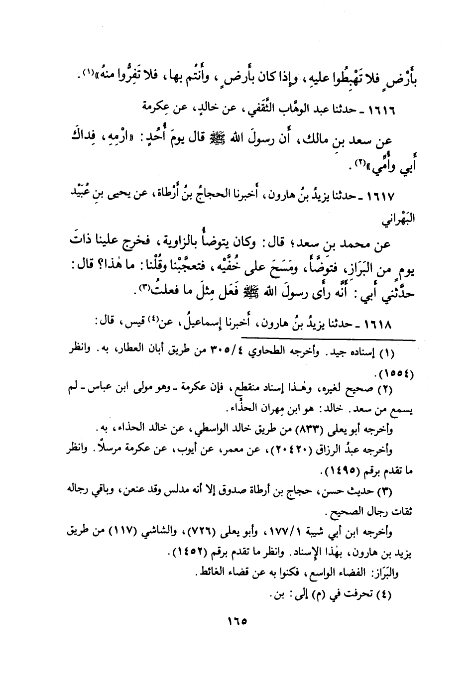 ١٦١٦ - حَدَّثَنَا عَبْدُ الْوَهَّابِ الثَّقَفِيُّ، عَنْ خَالِدٍ، عَنْ عِكْرِمَةَ، عَنْ سَعْدِ بْنِ مَالِكٍ: أَنَّ رَسُولَ اللهِ صَلَّى اللهُ عَلَيْهِ وَسَلَّمَ، قَالَ يَوْمَ أُحُدٍ: " ارْمِهْ فِدَاكَ أَبِي وَأُمِّي " (٢)