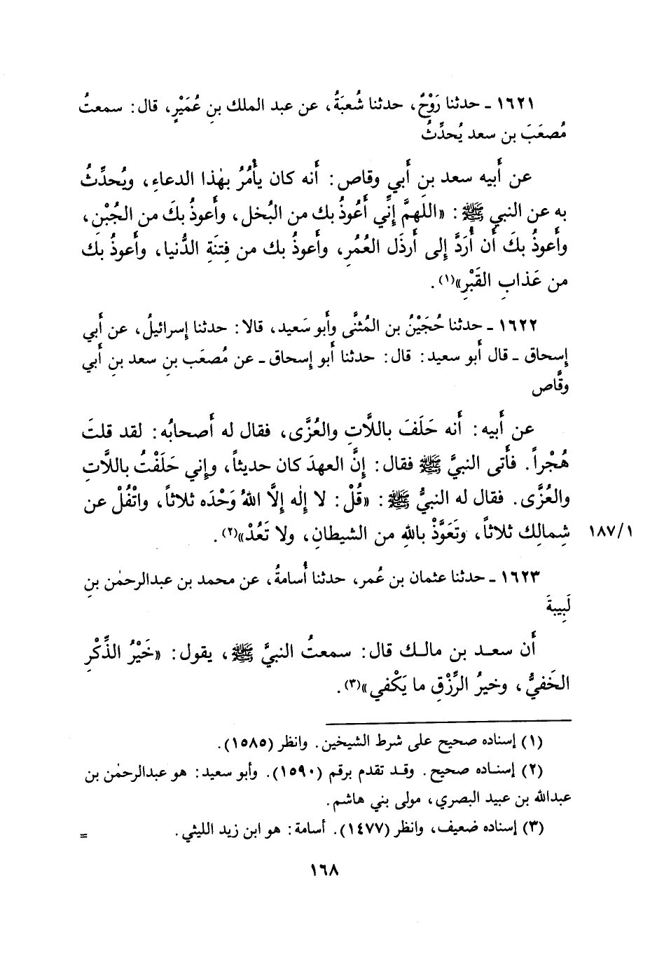 ١٦٢١ - حَدَّثَنَا رَوْحٌ، حَدَّثَنَا شُعْبَةُ، عَنْ عَبْدِ الْمَلِكِ بْنِ عُمَيْرٍ، قَالَ سَمِعْتُ مُصْعَبَ بْنَ سَعْدٍ، يُحَدِّثُ عَنْ أَبِيهِ سَعْدِ بْنِ أَبِي وَقَّاصٍ: أَنَّهُ كَانَ يَأْمُرُ بِهَذَا الدُّعَاءِ وَيُحَدِّثُ بِهِ عَنِ النَّبِيِّ صَلَّى اللهُ عَلَيْهِ وَسَلَّمَ: " اللهُمَّ إِنِّي أَعُوذُ بِكَ مِنَ البُخْلِ، وَأَعُوذُ بِكَ مِنَ الجُبْنِ، وَأَعُوذُ بِكَ أَنْ أُرَدَّ إِلَى أَرْذَلِ الْعُمُرِ، وَأَعُوذُ بِكَ مِنْ فِتْنَةِ الدُّنْيَا، وَأَعُوذُ بِكَ مِنْ عَذَابِ الْقَبْرِ " (١)