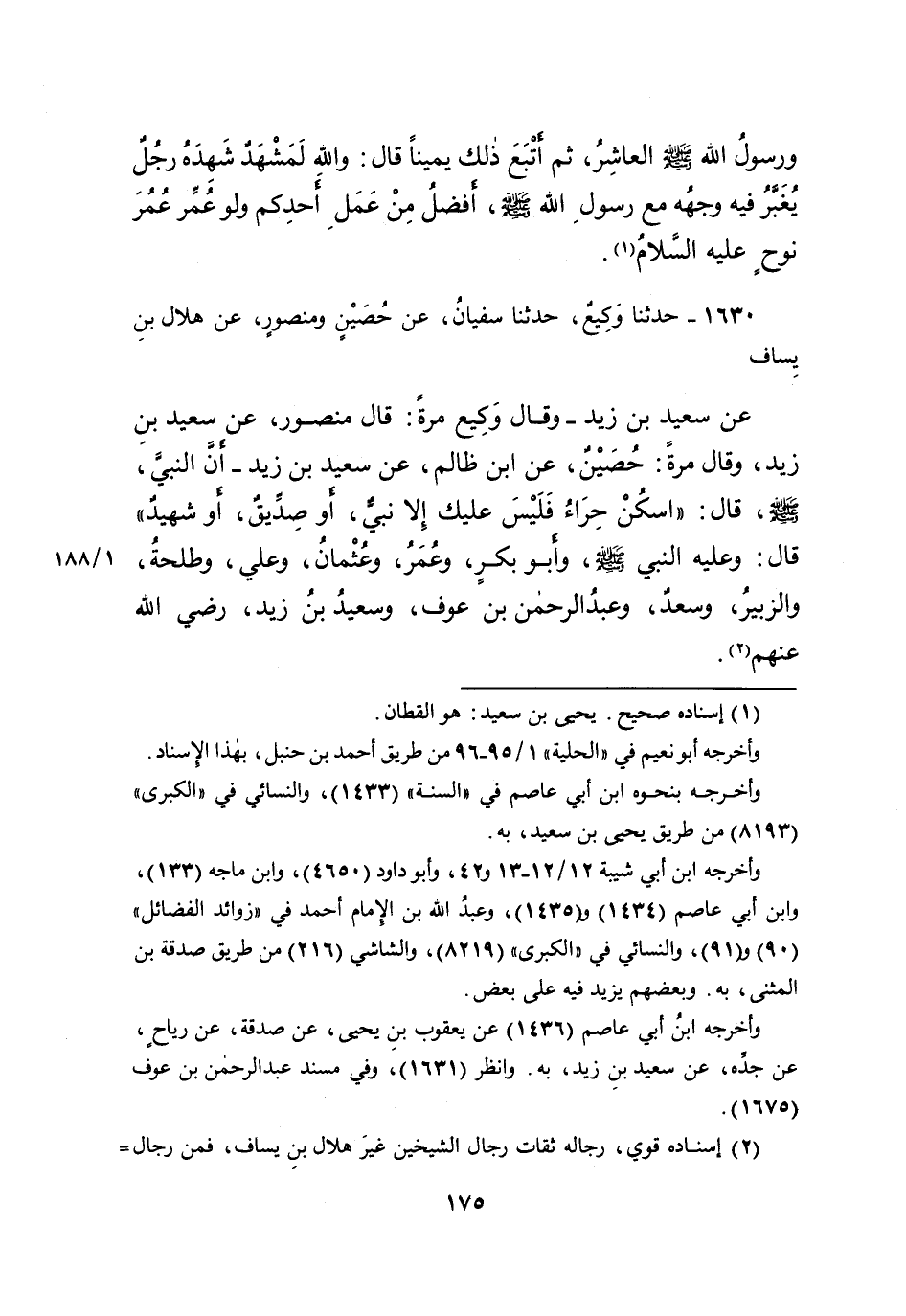 ١٦٣٠ - حَدَّثَنَا وَكِيعٌ، حَدَّثَنَا سُفْيَانُ، عَنْ حُصَيْنٍ، وَمَنْصُورٍ، عَنْ هِلالِ بْنِ يِسَافٍ، عَنْ سَعِيدِ بْنِ زَيْدٍ، وَقَالَ وَكِيعٌ مَرَّةً: قَالَ مَنْصُورٌ: عَنْ سَعِيدِ بْنِ زَيْدٍ، وَقَالَ مَرَّةً: حُصَيْنٌ، عَنِ ابْنِ ظَالِمٍ، عَنْ سَعِيدِ بْنِ زَيْدٍ: أَنَّ النَّبِيَّ صَلَّى اللهُ عَلَيْهِ وَسَلَّمَ، قَالَ: " اسْكُنْ حِرَاءُ، فَلَيْسَ عَلَيْكَ إِلا نَبِيٌّ، أَوْ صِدِّيقٌ، أَوْ شَهِيدٌ "، قَالَ: وَعَلَيْهِ النَّبِيُّ صَلَّى اللهُ عَلَيْهِ وَسَلَّمَ، وَأَبُو بَكْرٍ، وَعُمَرُ، وَعُثْمَانُ، وَعَلِيٌّ، وَطَلْحَةُ، وَالزُّبَيْرُ، وَسَعْدٌ، وَعَبْدُ الرَّحْمَنِ بْنُ عَوْفٍ، وَسَعِيدُ بْنُ زَيْدٍ رَضِيَ اللهُ عَنْهُمْ (٢)