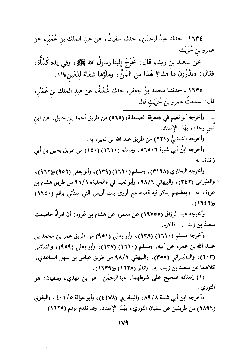 ١٦٣٤ - حَدَّثَنَا عَبْدُ الرَّحْمَنِ، حَدَّثَنَا سُفْيَانُ، عَنْ عَبْدِ الْمَلِكِ بْنِ عُمَيْرٍ، عَنْ عَمْرِو بْنِ حُرَيْثٍ، عَنْ سَعِيدِ بْنِ زَيْدٍ، قَالَ: خَرَجَ إِلَيْنَا رَسُولُ اللهِ صَلَّى اللهُ عَلَيْهِ وَسَلَّمَ، وَفِي يَدِهِ كَمْأَةٌ، فَقَالَ: " تَدْرُونَ مَا هَذَا؟ هَذَا مِنَ المَنِّ، وَمَاؤُهَا شِفَاءٌ لِلعَيْنِ " (١)