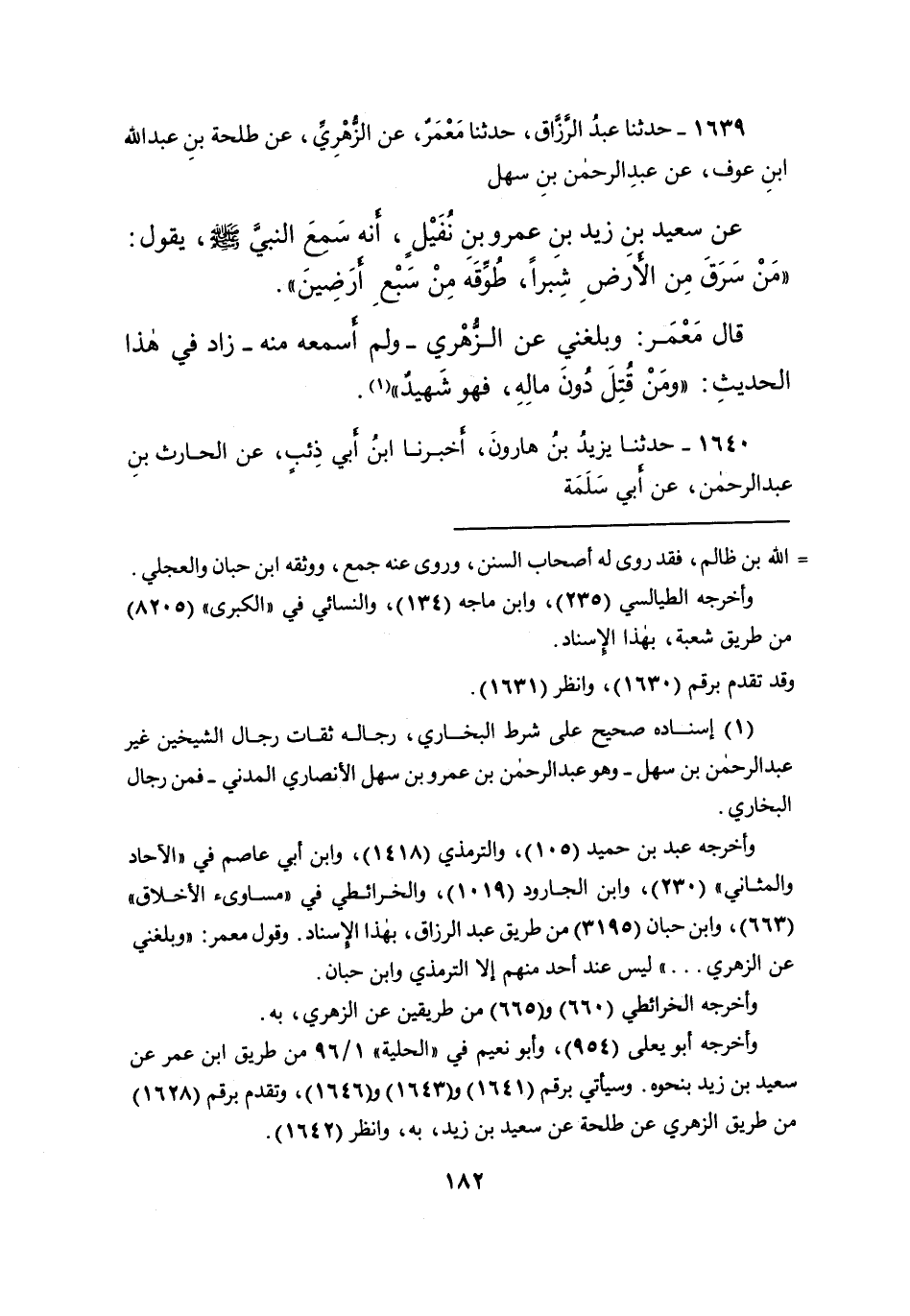 ١٦٣٩ - حَدَّثَنَا عَبْدُ الرَّزَّاقِ، حَدَّثَنَا مَعْمَرٌ، عَنِ الزُّهْرِيِّ، عَنْ طَلْحَةَ بْنِ عَبْدِ اللهِ بْنِ عَوْفٍ، عَنْ عَبْدِ الرَّحْمَنِ بْنِ سَهْلٍ، عَنْ سَعِيدِ بْنِ زَيْدِ بْنِ عَمْرِو بْنِ نُفَيْلٍ، أَنَّهُ سَمِعَ النَّبِيَّ صَلَّى اللهُ عَلَيْهِ وَسَلَّمَ، يَقُولُ: " مَنْ سَرَقَ مِنَ الأَرْضِ شِبْرًا طُوِّقَهُ مِنْ سَبْعِ أَرَضِينَ " قَالَ مَعْمَرٌ: وَبَلَغَنِي عَنِ الزُّهْرِيِّ، وَلَمْ أَسْمَعْهُ مِنْهُ زَادَ فِي هَذَا الْحَدِيثِ: " وَمَنْ قُتِلَ دُونَ مَالِهِ فَهُوَ شَهِيدٌ " (١)