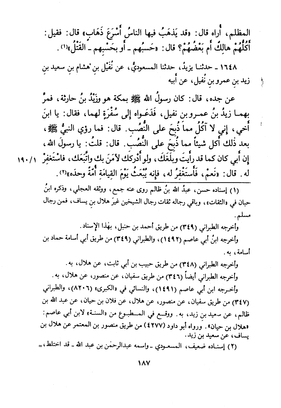 ١٦٤٨ - حَدَّثَنَا يَزِيدُ، حَدَّثَنَا الْمَسْعُودِيُّ، عَنْ نُفَيْلِ بْنِ هِشَامِ بْنِ سَعِيدِ بْنِ زَيْدِ بْنِ عَمْرِو بْنِ نُفَيْلٍ، عَنْ أَبِيهِ، عَنْ جَدِّهِ، قَالَ: كَانَ رَسُولُ اللهِ صَلَّى اللهُ عَلَيْهِ وَسَلَّمَ بِمَكَّةَ هُوَ وَزَيْدُ بْنُ حَارِثَةَ، فَمَرَّ بِهِمَا زَيْدُ بْنُ عَمْرِو بْنِ نُفَيْلٍ، فَدَعَوَاهُ إِلَى سُفْرَةٍ لَهُمَا، فَقَالَ: يَا ابْنَ أَخِي، إِنِّي لَا آكُلُ مِمَّا ذُبِحَ عَلَى النُّصُبِ، قَالَ: فَمَا رُئِيَ النَّبِيُّ صَلَّى اللهُ عَلَيْهِ وَسَلَّمَ، بَعْدَ ذَلِكَ أَكَلَ شَيْئًا مِمَّا ذُبِحَ عَلَى النُّصُبِ. قَالَ: قُلْتُ يَا رَسُولَ اللهِ إِنَّ أَبِي كَانَ كَمَا قَدْ رَأَيْتَ وَبَلَغَكَ، وَلَوْ أَدْرَكَكَ لآمَنَ بِكَ وَاتَّبَعَكَ، فَاسْتَغْفِرْ لَهُ؟ قَالَ: " نَعَمْ، فَأَسْتَغْفِرُ لَهُ، فَإِنَّهُ يُبْعَثُ يَوْمَ الْقِيَامَةِ أُمَّةً وَحْدَهُ " (٢)