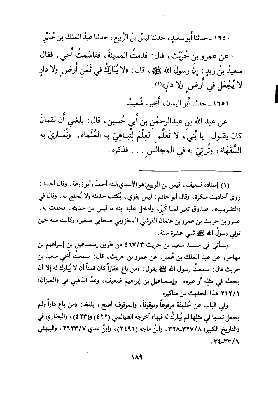 ١٦٥٠ - حَدَّثَنَا أَبُو سَعِيدٍ، حَدَّثَنَا قَيْسُ بْنُ الرَّبِيعِ، حَدَّثَنَا عَبْدُ الْمَلِكِ بْنُ عُمَيْرٍ، عَنْ عَمْرِو بْنِ حُرَيْثٍ، قَالَ: قَدِمْتُ الْمَدِينَةَ، فَقَاسَمْتُ أَخِي، فَقَالَ سَعِيدُ بْنُ زَيْدٍ: إِنَّ رَسُولَ اللهِ صَلَّى اللهُ عَلَيْهِ وَسَلَّمَ قَالَ: " لَا يُبَارَكُ فِي ثَمَنِ أَرْضٍ، وَلا دَارٍ لَا يُجْعَلُ فِي أَرْضٍ وَلا دَارٍ " (١)