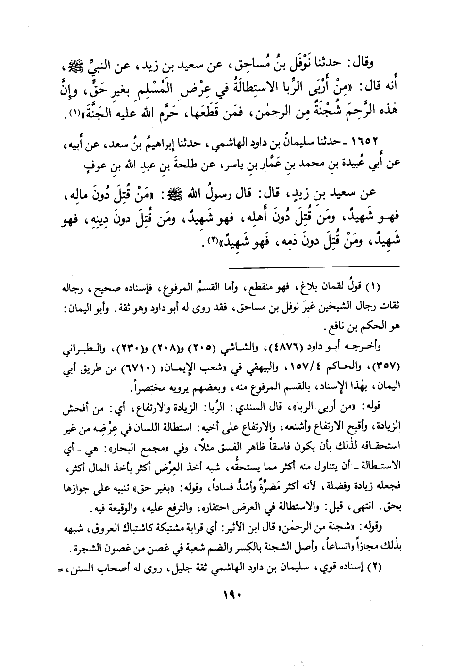 ١٦٥٢ - حَدَّثَنَا سُلَيْمَانُ بْنُ دَاوُدَ الْهَاشِمِيُّ، حَدَّثَنَا إِبْرَاهِيمُ بْنُ سَعْدٍ، عَنْ أَبِيهِ، عَنْ أَبِي عُبَيْدَةَ بْنِ مُحَمَّدِ بْنِ عَمَّارِ بْنِ يَاسِرٍ، عَنْ طَلْحَةَ بْنِ عَبْدِ اللهِ بْنِ عَوْفٍ، عَنْ سَعِيدِ بْنِ زَيْدٍ، قَالَ: قَالَ رَسُولُ اللهِ صَلَّى اللهُ عَلَيْهِ وَسَلَّمَ: " مَنْ قُتِلَ دُونَ مَالِهِ فَهُوَ شَهِيدٌ، وَمَنْ قُتِلَ دُونَ أَهْلِهِ فَهُوَ شَهِيدٌ، وَمَنْ قُتِلَ دُونَ دِينِهِ فَهُوَ شَهِيدٌ، وَمَنْ قُتِلَ دُونَ دَمِهِ فَهُوَ شَهِيدٌ " (٢)