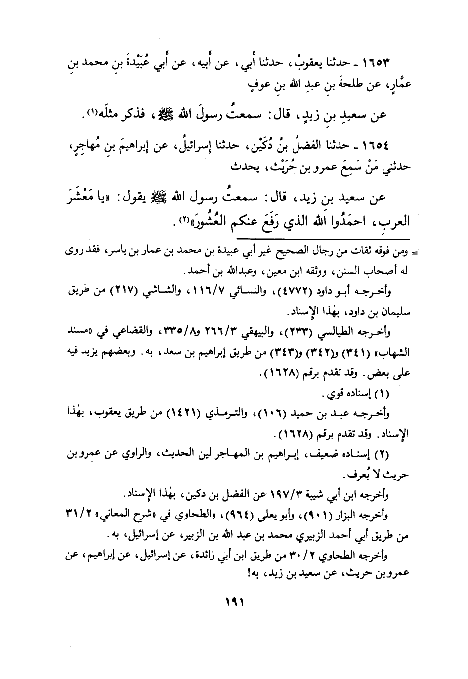 ١٦٥٤ - حَدَّثَنَا الْفَضْلُ بْنُ دُكَيْنٍ، حَدَّثَنَا إِسْرَائِيلُ، عَنْ إِبْرَاهِيمَ بْنِ مُهَاجِرٍ، حَدَّثَنِي مَنْ سَمِعَ، عَمْرَو بْنَ حُرَيْثٍ، يُحَدِّثُ عَنْ سَعِيدِ بْنِ زَيْدٍ، قَالَ: سَمِعْتُ رَسُولَ اللهِ صَلَّى اللهُ عَلَيْهِ وَسَلَّمَ، يَقُولُ: " يَا مَعْشَرَ الْعَرَبِ، احْمَدُوا اللهَ الَّذِي رَفَعَ عَنْكُمُ الْعُشُورََ " (٢)