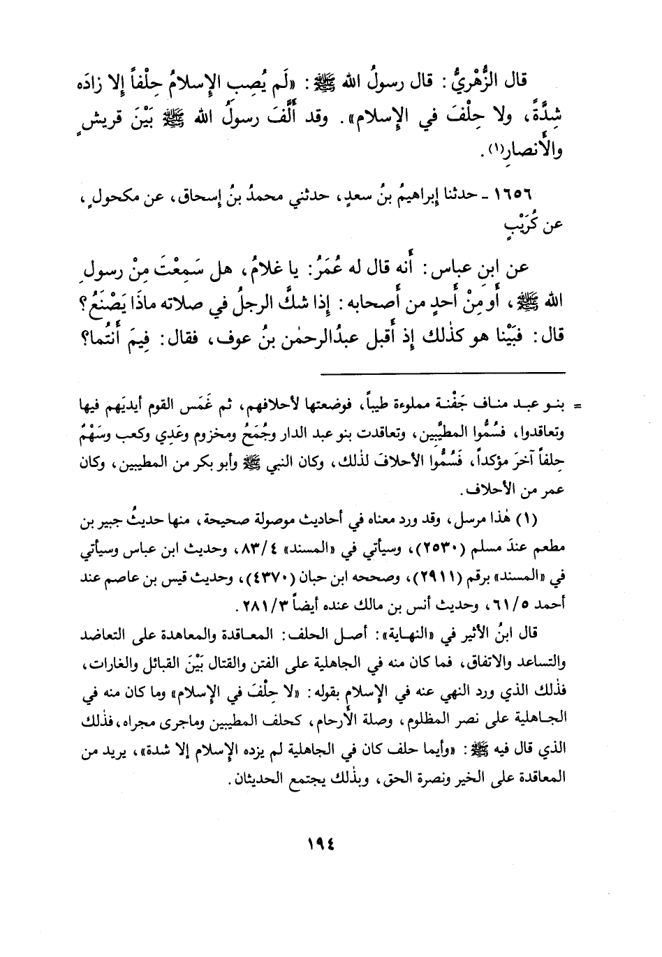 قَالَ الزُّهْرِيُّ: قَالَ رَسُولُ اللهِ صَلَّى اللهُ عَلَيْهِ وَسَلَّمَ: " لَمْ يُصِبِ الْإِسْلامُ حِلْفًا إِلا زَادَهُ شِدَّةً، وَلا حِلْفَ فِي الْإِسْلامِ "، وَقَدْ أَلَّفَ رَسُولُ اللهِ صَلَّى اللهُ عَلَيْهِ وَسَلَّمَ بَيْنَ قُرَيْشٍ، وَالْأَنْصَارِ (١)