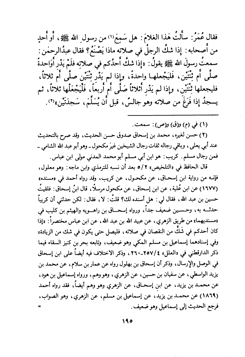 فَقَالَ عُمَرُ: سَأَلْتُ هَذَا الْغُلامَ: هَلْ سَمِعَ (١) مِنْ رَسُولِ اللهِ صَلَّى اللهُ عَلَيْهِ وَسَلَّمَ، أَوْ أَحَدٍ مِنْ أَصْحَابِهِ إِذَا شَكَّ الرَّجُلُ فِي صَلاتِهِ مَاذَا يَصْنَعُ؟ فَقَالَ عَبْدُ الرَّحْمَنِ: سَمِعْتُ رَسُولَ اللهِ صَلَّى اللهُ عَلَيْهِ وَسَلَّمَ، يَقُولُ: " إِذَا شَكَّ أَحَدُكُمْ فِي صَلاتِهِ، فَلَمْ يَدْرِ أَوَاحِدَةً صَلَّى أَمْ ثِنْتَيْنِ؟ فَلْيَجْعَلْهَا وَاحِدَةً، وَإِذَا لَمْ يَدْرِ ثِنْتَيْنِ صَلَّى أَمْ ثَلاثًا؟ فَلْيَجْعَلْهَا ثِنْتَيْنِ، وَإِذَا لَمْ يَدْرِ أَثَلاثًا صَلَّى أَمِ ارْبَعًا؟ فَلْيَجْعَلْهَا ثَلاثًا، ثُمَّ يَسْجُدِ اذَا فَرَغَ مِنْ صَلاتِهِ وَهُوَ جَالِسٌ قَبْلَ أَنْ يُسَلِّمَ سَجْدَتَيْنِ " (٢)