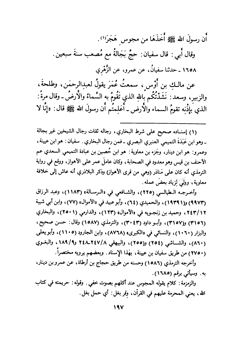 أَنَّ رَسُولَ اللهِ صَلَّى اللهُ عَلَيْهِ وَسَلَّمَ، أَخَذَهَا مِنْ مَجُوسِ هَجَرَ، (١) وقَالَ أًبي: وقَالَ سُفْيَانُ: حَجَّ بَجَالَةُ مَعَ مُصْعَبٍ سَنَةَ سَبْعِينَ