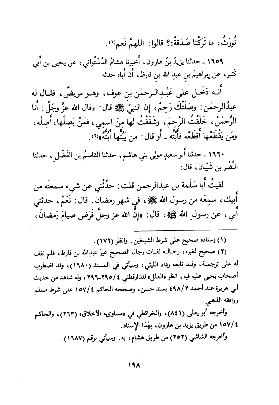 ١٦٥٩ - حَدَّثَنَا يَزِيدُ بْنُ هَارُونَ، أَخْبَرَنَا هِشَامٌ الدَّسْتُوَائِيُّ، عَنْ يَحْيَى بْنِ أَبِي كَثِيرٍ، عَنْ إِبْرَاهِيمَ بْنِ عَبْدِ اللهِ بْنِ قَارِظٍ، أَنَّ أَبَاهُ حَدَّثَهُ: أَنَّهُ دَخَلَ عَلَى عَبْدِ الرَّحْمَنِ بْنِ عَوْفٍ وَهُوَ مَرِيضٌ، فَقَالَ لَهُ عَبْدُ الرَّحْمَنِ: وَصَلَتْكَ رَحِمٌ إِنَّ النَّبِيَّ صَلَّى اللهُ عَلَيْهِ وَسَلَّمَ، قَالَ: " قَالَ اللهُ عَزَّ وَجَلَّ: أَنَا الرَّحْمَنُ خَلَقْتُ الرَّحِمَ، وَشَقَقْتُ لَهَا مِنَ اسْمِي، فَمَنْ يَصِلْهَا أَصِلْهُ، وَمَنْ يَقْطَعْهَا أَقْطَعْهُ، فَأَبُتَّهُ - أَوْ قَالَ: مَنْ يَبُتَّهَا أَبُتَّهُ " (٢)
