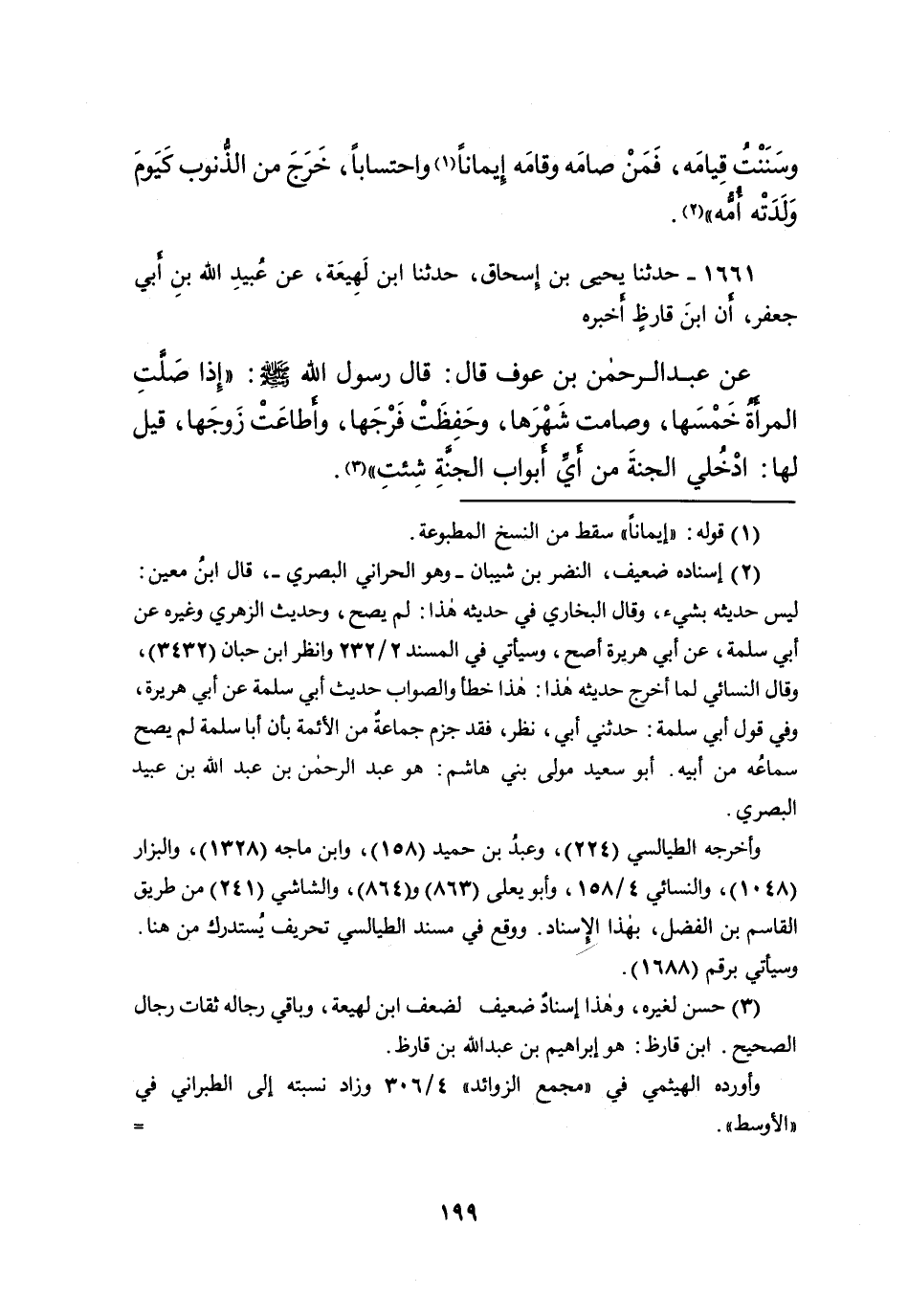 ١٦٦١ - حَدَّثَنَا يَحْيَى بْنُ إِسْحَاقَ، حَدَّثَنَا ابْنُ لَهِيعَةَ، عَنْ عُبَيْدِ اللهِ بْنِ أَبِي جَعْفَرٍ، أَنَّ ابْنَ قَارِظٍ، أَخْبَرَهُ عَنْ عَبْدِ الرَّحْمَنِ بْنِ عَوْفٍ، قَالَ: قَالَ رَسُولُ اللهِ صَلَّى اللهُ عَلَيْهِ وَسَلَّمَ: " إِذَا صَلَّتِ الْمَرْأَةُ خَمْسَهَا، وَصَامَتْ شَهْرَهَا، وَحَفِظَتْ فَرْجَهَا، وَأَطَاعَتْ زَوْجَهَا قِيلَ لَهَا: ادْخُلِي الْجَنَّةَ مِنْ أَيِّ أَبْوَابِ الْجَنَّةِ شِئْتِ " (٣)