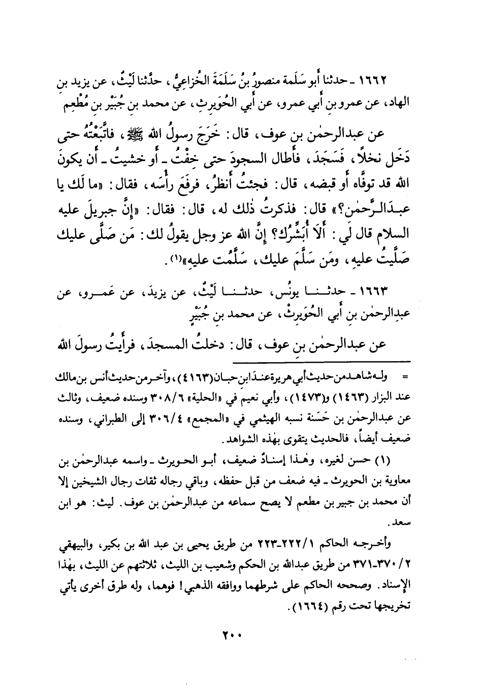 ١٦٦٣ - حَدَّثَنَا يُونُسُ، حَدَّثَنَا لَيْثٌ، عَنْ يَزِيدَ، عَنْ عَمْرٍو، عَنْ عَبْدِ الرَّحْمَنِ أَبِي الْحُوَيْرِثِ، عَنْ مُحَمَّدِ بْنِ جُبَيْرٍ، عَنْ عَبْدِ الرَّحْمَنِ بْنِ عَوْفٍ، قَالَ: دَخَلْتُ الْمَسْجِدَ، فَرَأَيْتُ رَسُولَ اللهِ صَلَّى اللهُ عَلَيْهِ وَسَلَّمَ،
