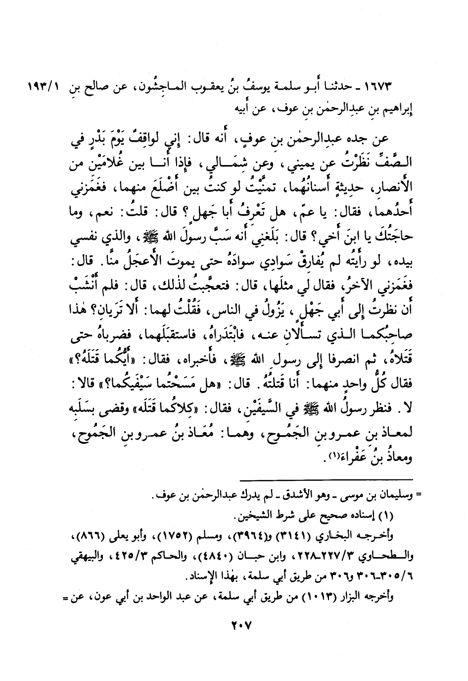 ١٦٧٣ - حَدَّثَنَا أَبُو سَلَمَةَ يُوسُفُ بْنُ يَعْقُوبَ الْمَاجِشُونُ، عَنْ صَالِحِ بْنِ إِبْرَاهِيمَ بْنِ عَبْدِ الرَّحْمَنِ بْنِ عَوْفٍ، عَنْ أَبِيهِ، عَنْ جَدِّهِ عَبْدِ الرَّحْمَنِ بْنِ عَوْفٍ، أَنَّهُ قَالَ: إِنِّي لَوَاقِفٌ يَوْمَ بَدْرٍ فِي الصَّفِّ، نَظَرْتُ عَنْ يَمِينِي وَعَنْ شِمَالِي، فَإِذَا أَنَا بَيْنَ غُلامَيْنِ مِنَ الْأَنْصَارِ حَدِيثَةٍ أَسْنَانُهُمَا، تَمَنَّيْتُ لَوْ كُنْتُ بَيْنَ أَضْلَعَ مِنْهُمَا، فَغَمَزَنِي أَحَدُهُمَا، فَقَالَ: يَا عَمِّ هَلْ تَعْرِفُ أَبَا جَهْلٍ؟ قَالَ: قُلْتُ: نَعَمْ، وَمَا حَاجَتُكَ يَا ابْنَ أَخِي؟ قَالَ: بَلَغَنِي أَنَّهُ سَبَّ رَسُولَ اللهِ صَلَّى اللهُ عَلَيْهِ وَسَلَّمَ، وَالَّذِي نَفْسِي بِيَدِهِ لَوْ رَأَيْتُهُ لَمْ يُفَارِقْ سَوَادِي سَوَادَهُ حَتَّى يَمُوتَ الْأَعْجَلُ مِنَّا، قَالَ: فَغَمَزَنِي الْآخَرُ فَقَالَ لِي مِثْلَهَا، قَالَ: فَتَعَجَّبْتُ لِذَلِكَ، قَالَ: فَلَمْ أَنْشَبْ أَنْ نَظَرْتُ إِلَى أَبِي جَهْلٍ يَجُولُ فِي النَّاسِ، فَقُلْتُ لَهُمَا: أَلا تَرَيَانِ هَذَا صَاحِبُكُمَا الَّذِي تَسْأَلانِ عَنْهُ، فَابْتَدَرَاهُ فَاسْتَقْبَلَهُمَا، فَضَرَبَاهُ حَتَّى قَتَلاهُ ثُمَّ انْصَرَفَا إِلَى رَسُولِ اللهِ صَلَّى اللهُ عَلَيْهِ وَسَلَّمَ، فَأَخْبَرَاهُ فَقَالَ: " أَيُّكُمَا قَتَلَهُ؟ " فَقَالَ كُلُّ وَاحِدٍ مِنْهُمَا: أَنَا قَتَلْتُهُ، قَالَ: " هَلْ مَسَحْتُمَا سَيْفَيْكُمَا؟ " قَالا: لَا، فَنَظَرَ رَسُولُ اللهِ صَلَّى اللهُ عَلَيْهِ وَسَلَّمَ، فِي السَّيْفَيْنِ فَقَالَ: " كِلاكُمَا قَتَلَهُ " وَقَضَى بِسَلَبِهِ لِمُعَاذِ بْنِ عَمْرِو بْنِ الْجَمُوحِ، وَهُمَا مُعَاذُ بْنُ عَمْرِو بْنِ الْجَمُوحِ، وَمُعَاذُ ابْنُ عَفْرَاءَ (١)