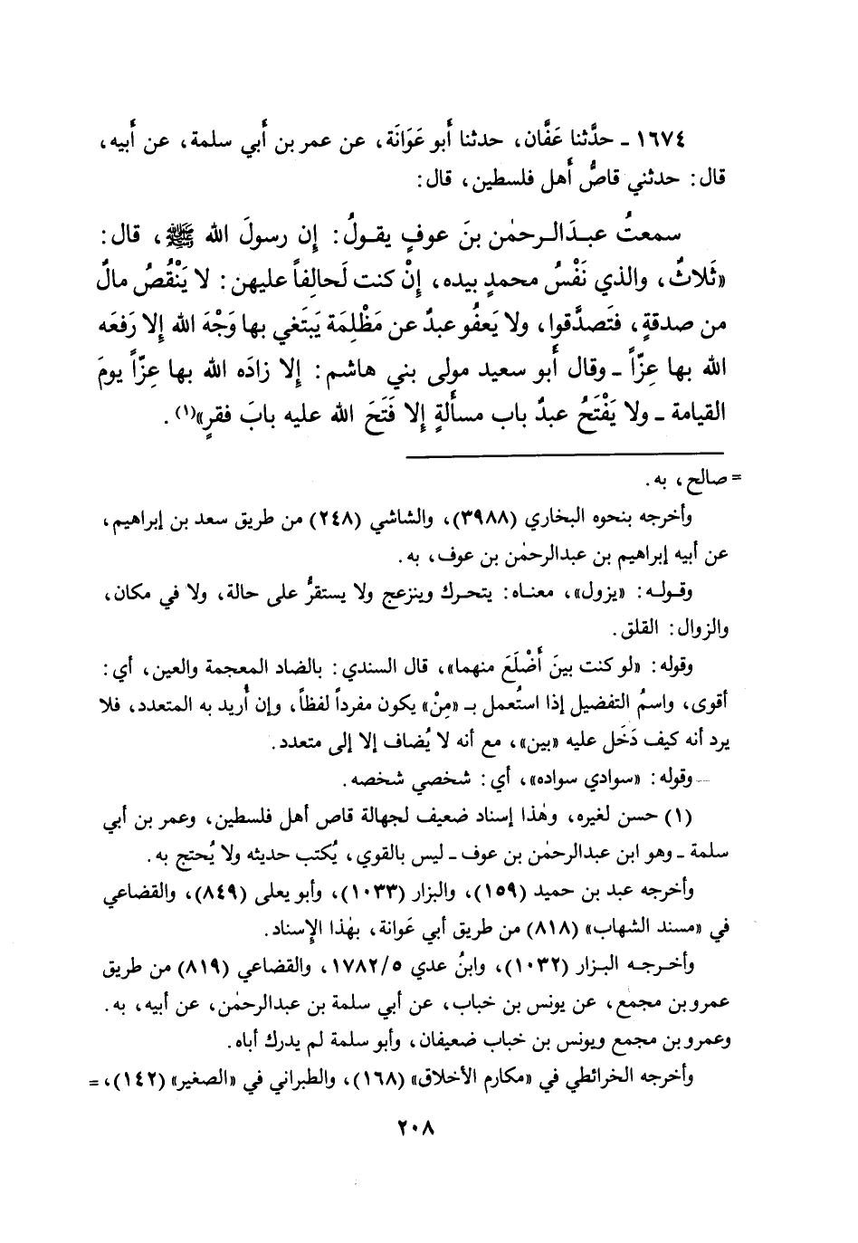 ١٦٧٤ - حَدَّثَنَا عَفَّانُ، حَدَّثَنَا أَبُو عَوَانَةَ، عَنْ عُمَرَ بْنِ أَبِي سَلَمَةَ، عَنْ أَبِيهِ، قَالَ: حَدَّثَنِي قَاصُّ أَهْلِ فِلَسْطِينَ قَالَ: سَمِعْتُ عَبْدَ الرَّحْمَنِ بْنَ عَوْفٍ، يَقُولُ: إِنَّ رَسُولَ اللهِ صَلَّى اللهُ عَلَيْهِ وَسَلَّمَ، قَالَ: " ثَلاثٌ وَالَّذِي نَفْسُ مُحَمَّدٍ بِيَدِهِ، إِنْ كُنْتُ لَحَالِفًا عَلَيْهِنَّ لَا يَنْقُصُ مَالٌ مِنْ صَدَقَةٍ فَتَصَدَّقُوا، وَلا يَعْفُو عَبْدٌ عَنْ مَظْلَمَةٍ يَبْتَغِي بِهَا وَجْهَ اللهِ إِلَّا رَفَعَهُ اللهُ بِهَا عِزًّا " وقَالَ أَبُو سَعِيدٍ مَوْلَى بَنِي هَاشِمٍ: " إِلا زَادَهُ اللهُ بِهَا عِزًّا يَوْمَ الْقِيَامَةِ، وَلا يَفْتَحُ عَبْدٌ بَابَ مَسْأَلَةٍ إِلا فَتَحَ اللهُ عَلَيْهِ بَابَ فَقْرٍ " (١)