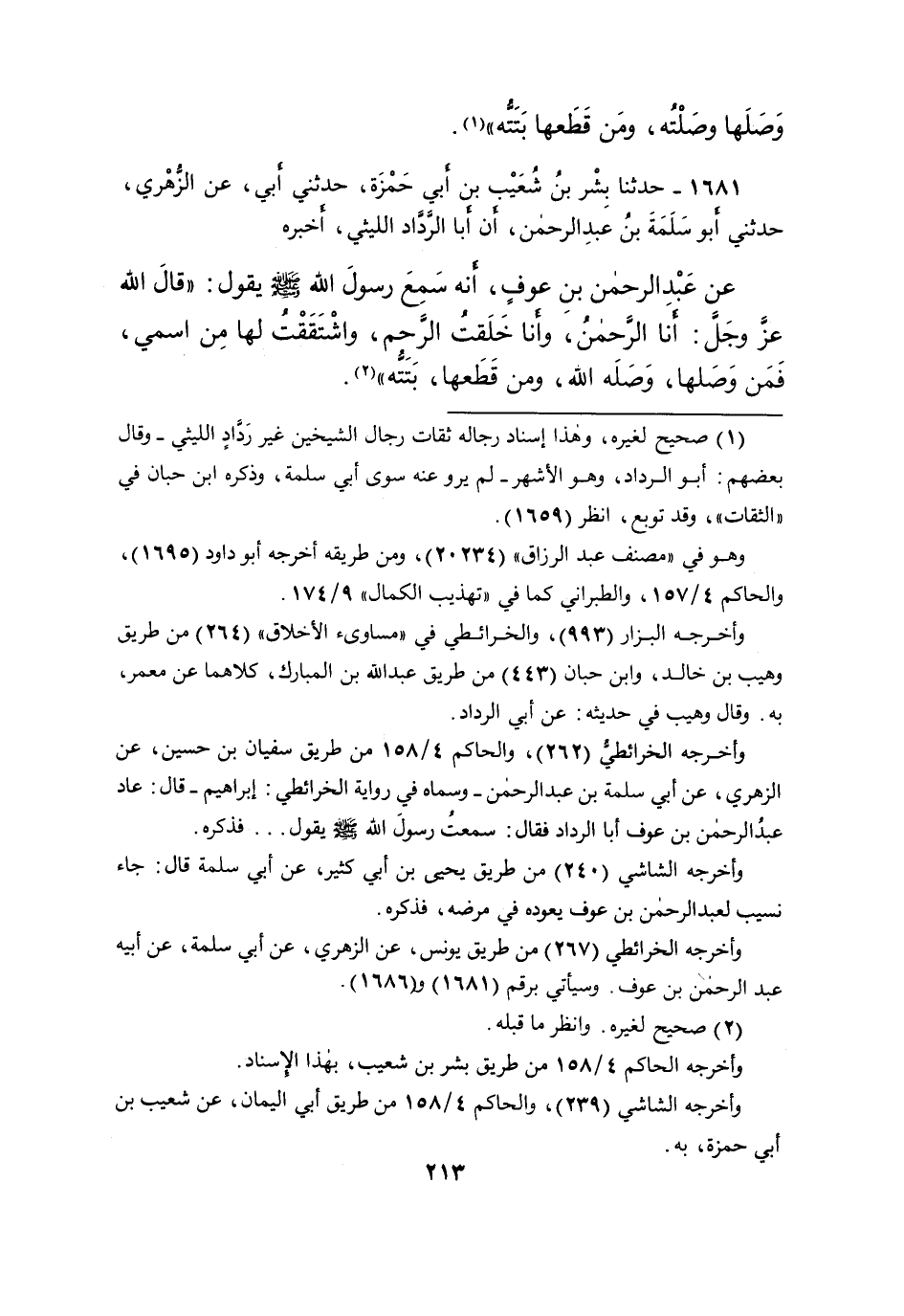 ١٦٨١ - حَدَّثَنَا بِشْرُ بْنُ شُعَيْبِ بْنِ أَبِي حَمْزَةَ، حَدَّثَنِي أَبِي، عَنِ الزُّهْرِيِّ، حَدَّثَنِي أَبُو سَلَمَةَ بْنُ عَبْدِ الرَّحْمَنِ، أَنَّ أَبَا الرَّدَّادِ اللَّيْثِيَّ أَخْبَرَهُ، عَنْ عَبْدِ الرَّحْمَنِ بْنِ عَوْفٍ، أَنَّهُ سَمِعَ رَسُولَ اللهِ صَلَّى اللهُ عَلَيْهِ وَسَلَّمَ، يَقُولُ: " قَالَ اللهُ عَزَّ وَجَلَّ: أَنَا الرَّحْمَنُ وَأَنَا خَلَقْتُ الرَّحِمَ، وَاشْتَقَقْتُ لَهَا مِنَ اسْمِي، فَمَنْ وَصَلَهَا وَصَلَهُ اللهُ، وَمَنْ قَطَعَهَا بَتَتُّهُ " (٢)