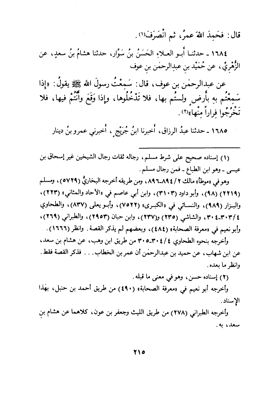 ١٦٨٤ - حَدَّثَنَا أَبُو الْعَلاءِ الْحَسَنُ بْنُ سَوَّارٍ، حَدَّثَنَا هِشَامُ بْنُ سَعْدٍ، عَنِ الزُّهْرِيِّ، عَنْ حُمَيْدِ بْنِ عَبْدِ الرَّحْمَنِ بْنِ عَوْفٍ، عَنْ عَبْدِ الرَّحْمَنِ بْنِ عَوْفٍ، قَالَ: سَمِعْتُ رَسُولَ اللهِ صَلَّى اللهُ عَلَيْهِ وَسَلَّمَ، يَقُولُ: " إِذَا سَمِعْتُمْ بِهِ بِأَرْضٍ وَلَسْتُمْ بِهَا، فَلا تَدْخُلُوهَا، وَإِذَا وَقَعَ وَأَنْتُمْ فِيهَا، فَلا تَخْرُجُوا فِرَارًا مِنْهَا " (٢)