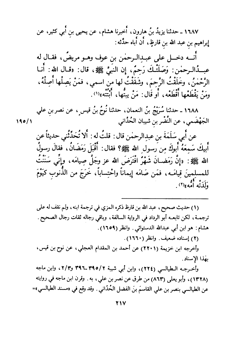 ١٦٨٧ - حَدَّثَنَا يَزِيدُ بْنُ هَارُونَ، أَخْبَرَنَا هِشَامٌ، عَنْ يَحْيَى بْنِ أَبِي كَثِيرٍ، عَنْ إِبْرَاهِيمَ بْنِ عَبْدِ اللهِ بْنِ قَارِظٍ، أَنَّ أَبَاهُ حَدَّثَهُ، أَنَّهُ دَخَلَ عَلَى عَبْدِ الرَّحْمَنِ بْنِ عَوْفٍ وَهُوَ مَرِيضٌ، فَقَالَ لَهُ عَبْدُ الرَّحْمَنِ وَصَلَتْكَ رَحِمٌ، إِنَّ النَّبِيَّ صَلَّى اللهُ عَلَيْهِ وَسَلَّمَ، قَالَ: " قَالَ اللهُ: أَنَا الرَّحْمَنُ، وَخَلَقْتُ الرَّحِمَ وَشَقَقْتُ لَهَا مِنَ اسْمِي، فَمَنْ يَصِلْهَا أَصِلْهُ، وَمَنْ يَقْطَعْهَا أَقْطَعْهُ - أَوْ قَالَ: مَنْ يَبُتَّهَا أَبْتُتْهُ " (١)
