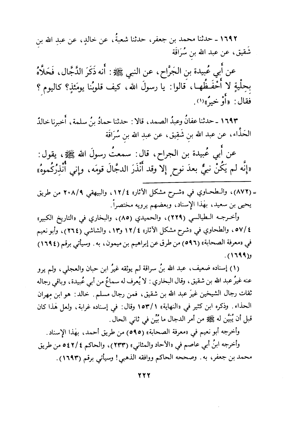١٦٩٢ - حَدَّثَنَا مُحَمَّدُ بْنُ جَعْفَرٍ، حَدَّثَنَا شُعْبَةُ، عَنْ خَالِدٍ، عَنْ عَبْدِ اللهِ بْنِ شَقِيقٍ، عَنْ عَبْدِ اللهِ بْنِ سُرَاقَةَ، عَنْ أَبِي عُبَيْدَةَ بْنِ الْجَرَّاحِ، عَنِ النَّبِيِّ صَلَّى اللهُ عَلَيْهِ وَسَلَّمَ، أَنَّهُ ذَكَرَ الدَّجَّالَ، فَحَلاهُ بِحِلْيَةٍ لَا أَحْفَظُهَا، قَالُوا: يَا رَسُولَ اللهِ: كَيْفَ قُلُوبُنَا يَوْمَئِذٍ كَالْيَوْمِ؟ فَقَالَ: " أَوْ خَيْرٌ " (١)