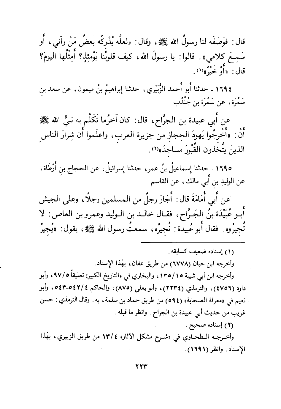 ١٦٩٤ - حَدَّثَنَا أَبُو أَحْمَدَ الزُّبَيْرِيُّ، حَدَّثَنَا إِبْرَاهِيمُ بْنُ مَيْمُونٍ، عَنْ سَعْدِ بْنِ سَمُرَةَ، عَنْ سَمُرَةَ بْنِ جُنْدُبٍ، عَنْ أَبِي عُبَيْدَةَ بْنِ الْجَرَّاحِ، قَالَ: كَانَ آخِرُ مَا تَكَلَّمَ بِهِ نَبِيُّ اللهِ صَلَّى اللهُ عَلَيْهِ وَسَلَّمَ: " أَنْ أَخْرِجُوا يَهُودَ الْحِجَازِ مِنْ جَزِيرَةِ الْعَرَبِ، وَاعْلَمُوا أَنَّ شِرَارَ النَّاسِ الَّذِينَ يَتَّخِذُونَ الْقُبُورَ مَسَاجِدَ " (٢)