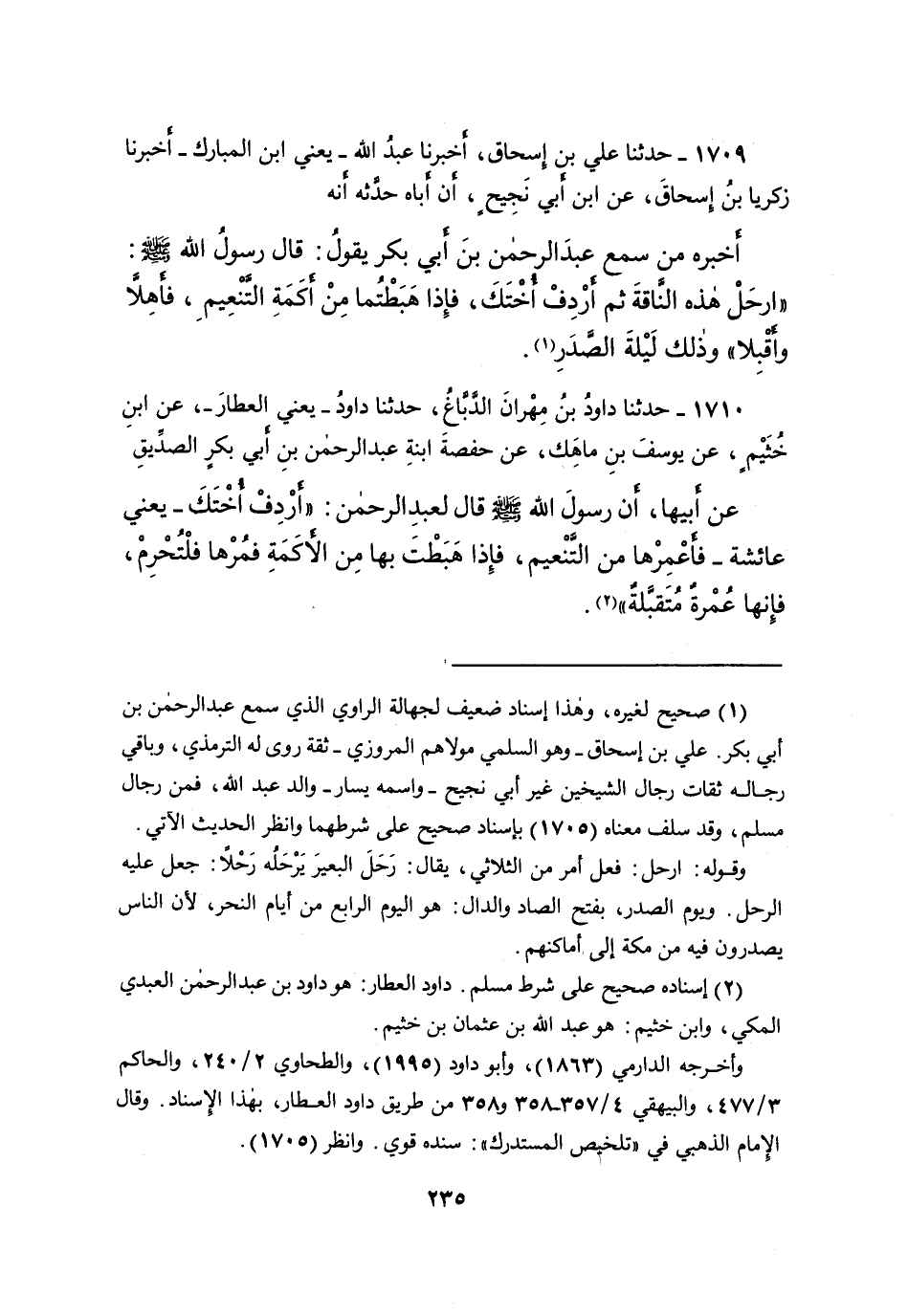 ١٧٠٩ - حَدَّثَنَا عَلِيُّ بْنُ إِسْحَاقَ، أَخْبَرَنَا عَبْدُ اللهِ يَعْنِي ابْنَ الْمُبَارَكِ، أَخْبَرَنَا زَكَرِيَّا بْنُ إِسْحَاقَ، عَنِ ابْنِ أَبِي نَجِيحٍ، أَنَّ أَبَاهُ حَدَّثَهُ، أَنَّهُ أَخْبَرَهُ مَنْ سَمِعَ عَبْدَ الرَّحْمَنِ بْنَ أَبِي بَكْرٍ، يَقُولُ: قَالَ رَسُولُ اللهِ صَلَّى اللهُ عَلَيْهِ وَسَلَّمَ: " ارْحَلْ هَذِهِ النَّاقَةَ، ثُمَّ أَرْدِفْ أُخْتَكَ، فَإِذَا هَبَطْتُمَا مِنْ أَكَمَةِ التَّنْعِيمِ فَأَهِلَّا وَأَقْبِلَا "، وَذَلِكَ لَيْلَةُ الصَّدَرِ (١)