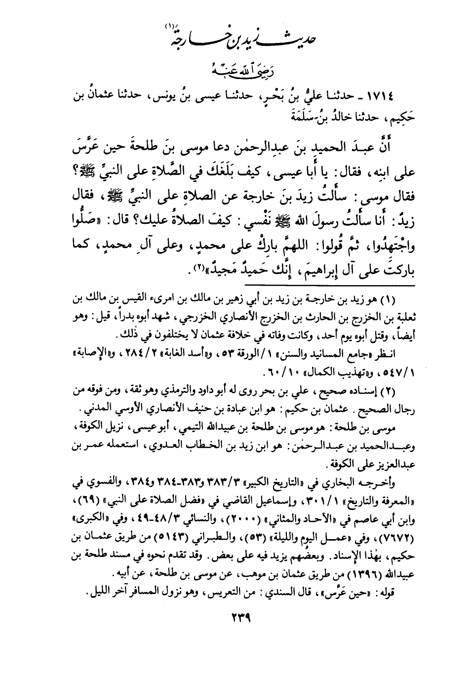 ١٧١٤ - حَدَّثَنَا عَلِيُّ بْنُ بَحْرٍ، حَدَّثَنَا عِيسَى بْنُ يُونُسَ، حَدَّثَنَا عُثْمَانُ بْنُ حَكِيمٍ، حَدَّثَنَا خَالِدُ بْنُ سَلَمَةَ، أَنْ عَبْدَ الْحَمِيدِ بْنَ عَبْدِ الرَّحْمَنِ، دَعَا مُوسَى بْنَ طَلْحَةَ حِينَ عَرَّسَ عَلَى ابْنِهِ، فَقَالَ: يَا أَبَا عِيسَى، كَيْفَ بَلَغَكَ فِي الصَّلاةِ عَلَى النَّبِيِّ صَلَّى اللهُ عَلَيْهِ وَسَلَّمَ؟ فَقَالَ مُوسَى: سَأَلْتُ زَيْدَ بْنَ خَارِجَةَ عَنِ الصَّلاةِ عَلَى النَّبِيِّ صَلَّى اللهُ عَلَيْهِ وَسَلَّمَ، فَقَالَ زَيْدٌ: أَنَا سَأَلْتُ رَسُولَ اللهِ صَلَّى اللهُ عَلَيْهِ وَسَلَّمَ نَفْسِي: كَيْفَ الصَّلَاةُ عَلَيْكَ؟ قَالَ: " صَلُّوا وَاجْتَهِدُوا، ثُمَّ قُولُوا: اللهُمَّ بَارِكْ عَلَى مُحَمَّدٍ وَعَلَى آلِ مُحَمَّدٍ، كَمَا بَارَكْتَ عَلَى إِبْرَاهِيمَ إِنَّكَ حَمِيدٌ مَجِيدٌ " (٢)