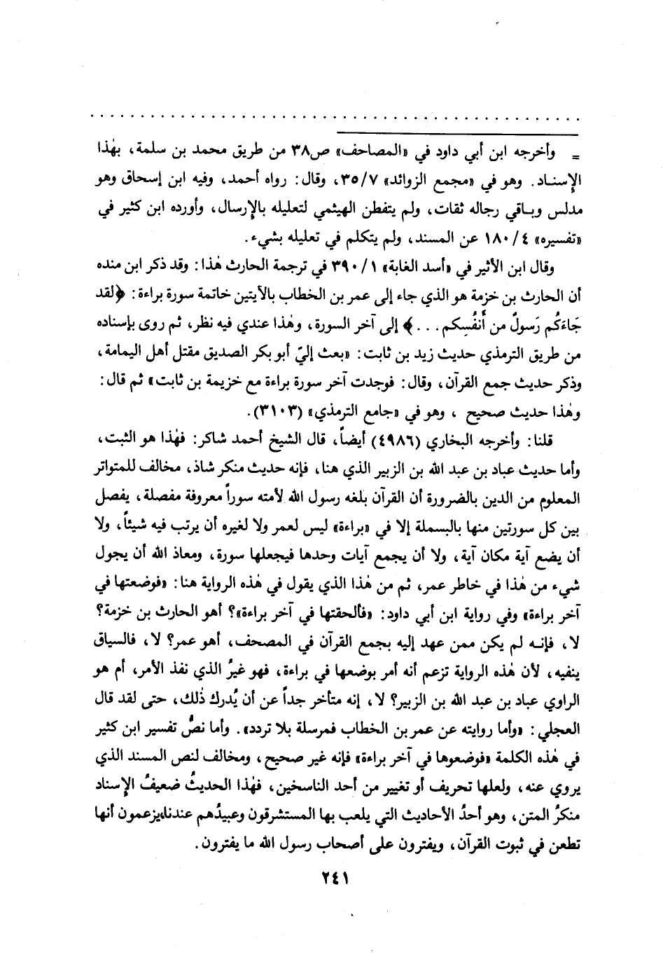 قلنا: وأخرجه البخاري (٤٩٨٦) أيضا، قال الشيخ أحمد شاكر: فهذا هو الثبت، وأما حديث عباد بن عبد الله بن الزبير الذي هنا، فانه حديث منكر شاذ، مخالف للمتواتر المعلوم من الدين بالضرورة أن القرآن بلغه رسول الله لأمته سوراً معروفة مفصلة، يفصل بين كل سورتين منها بالبسملة إلا في "براءة" ليس لعمر ولا لغيره أن يرتب فيه شيئاً، ولا أن يضع آية مكان آية، ولا أن يجمع آيات وحدها فيجعلها سورة، ومعاذ الله أن يجول شيء من هذا في خاطر عمر، ثم من هذا الذي يقول في هذه الرواية هنا: "فوضعتها في آخر براءة" وفي رواية ابن أبي داود: "فألحقتها في آخر براءة"؟ أهو الحارث بن خزمة؟ لا، فإنه لم يكن ممن عهد إليه بجمع القرآن في المصحف، أهو عمر؟ لا، فالسياق ينفيه، لأن هذه الرواية تزعم أنه أمر بوضعها في براءة، فهو غير الذي نفذ الأمر، أم هو