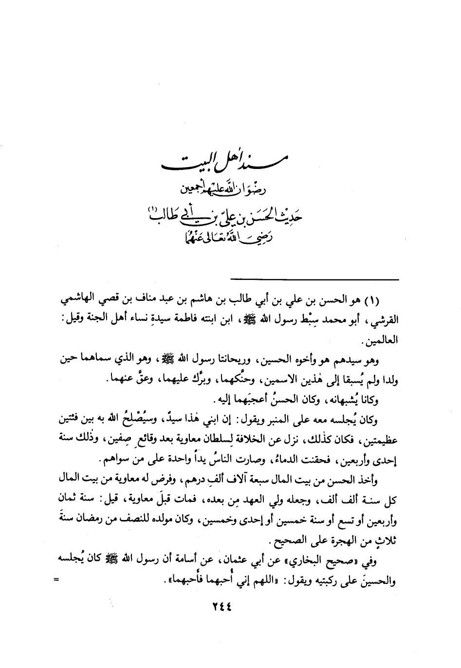 (١) هو الحسن بن علي بن أبي طالب بن هاشم بن عبد مناف بن قصي الهاشمي القرشي، أبو محمد سِبْط رسول الله صَلَّى اللهُ عَلَيْهِ وَسَلَّمَ، ابن ابنته فاطمة سيدةِ نساء أهل الجنة وقيل: العالمين.