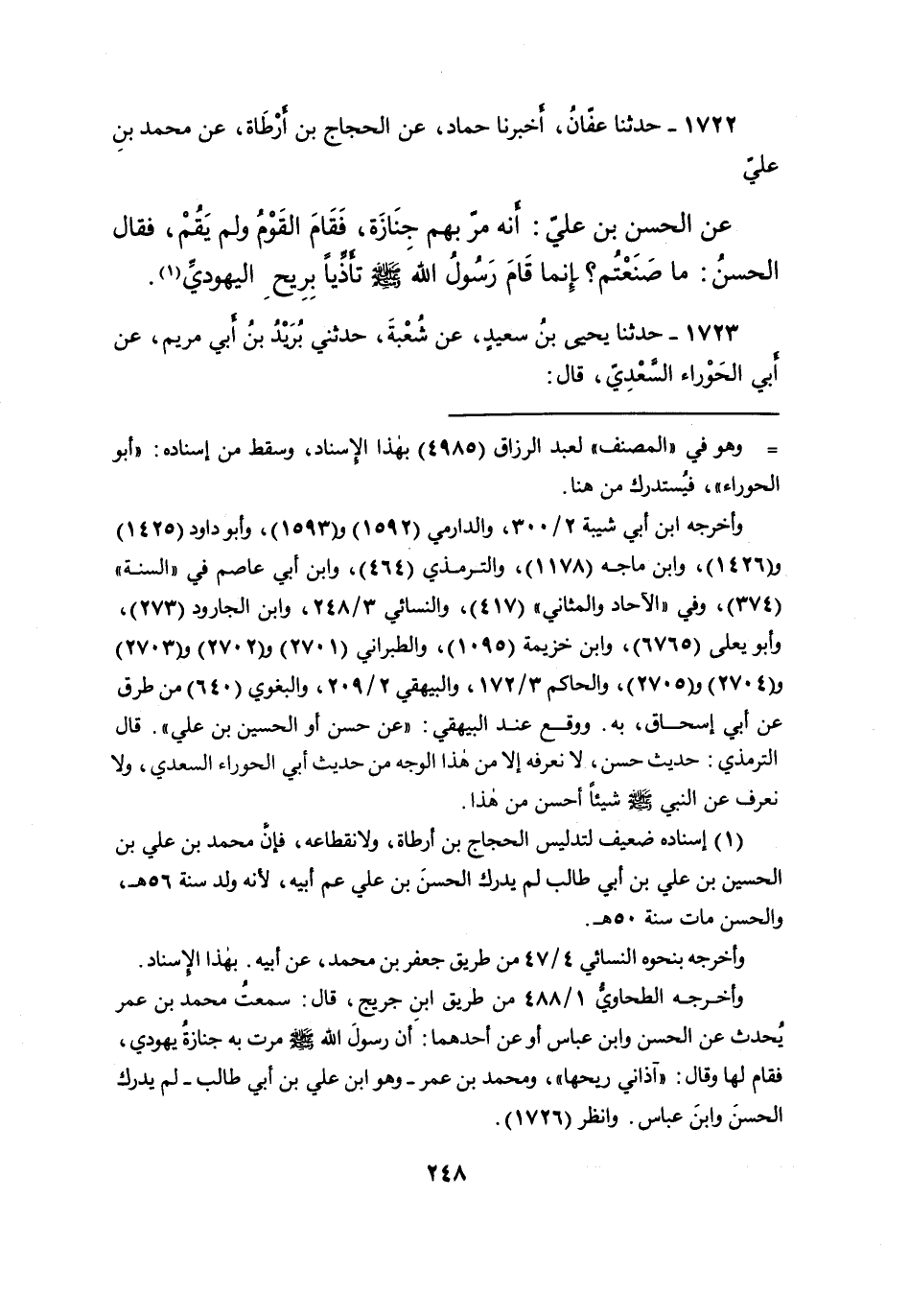 ١٧٢٢ - حَدَّثَنَا عَفَّانُ، أَخْبَرَنَا حَمَّادٌ، عَنِ الْحَجَّاجِ بْنِ أَرْطَاةَ، عَنْ مُحَمَّدِ بْنِ عَلِيٍّ، عَنِ الْحَسَنِ بْنِ عَلِيٍّ، أَنَّهُ مَرَّ بِهِمْ جَنَازَةٌ، فَقَامَ الْقَوْمُ وَلَمْ يَقُمْ، فَقَالَ الْحَسَنُ: " مَا صَنَعْتُمِ إنَّمَا قَامَ رَسُولُ اللهِ صَلَّى اللهُ عَلَيْهِ وَسَلَّمَ تَأَذِّيًا بِرِيحِ الْيَهُودِيِّ (١)