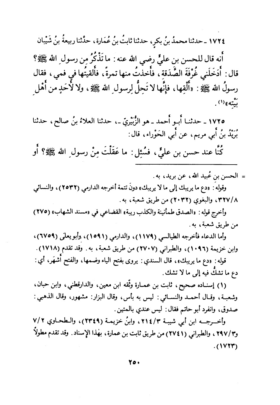 ١٧٢٥ - حَدَّثَنَا أَبُو أَحْمَدَ هُوَ الزُّبَيْرِيُّ، حَدَّثَنَا الْعَلاءُ بْنُ صَالِحٍ، حَدَّثَنَا بُرَيْدُ بْنُ أَبِي مَرْيَمَ، عَنْ أَبِي الْحَوْرَاءِ، قَالَ: كُنَّا عِنْدَ حَسَنِ بْنِ عَلِيٍّ، فَسُئِلَ مَا عَقَلْتَ مِنْ رَسُولِ اللهِ صَلَّى اللهُ عَلَيْهِ وَسَلَّمَ - أَوْ