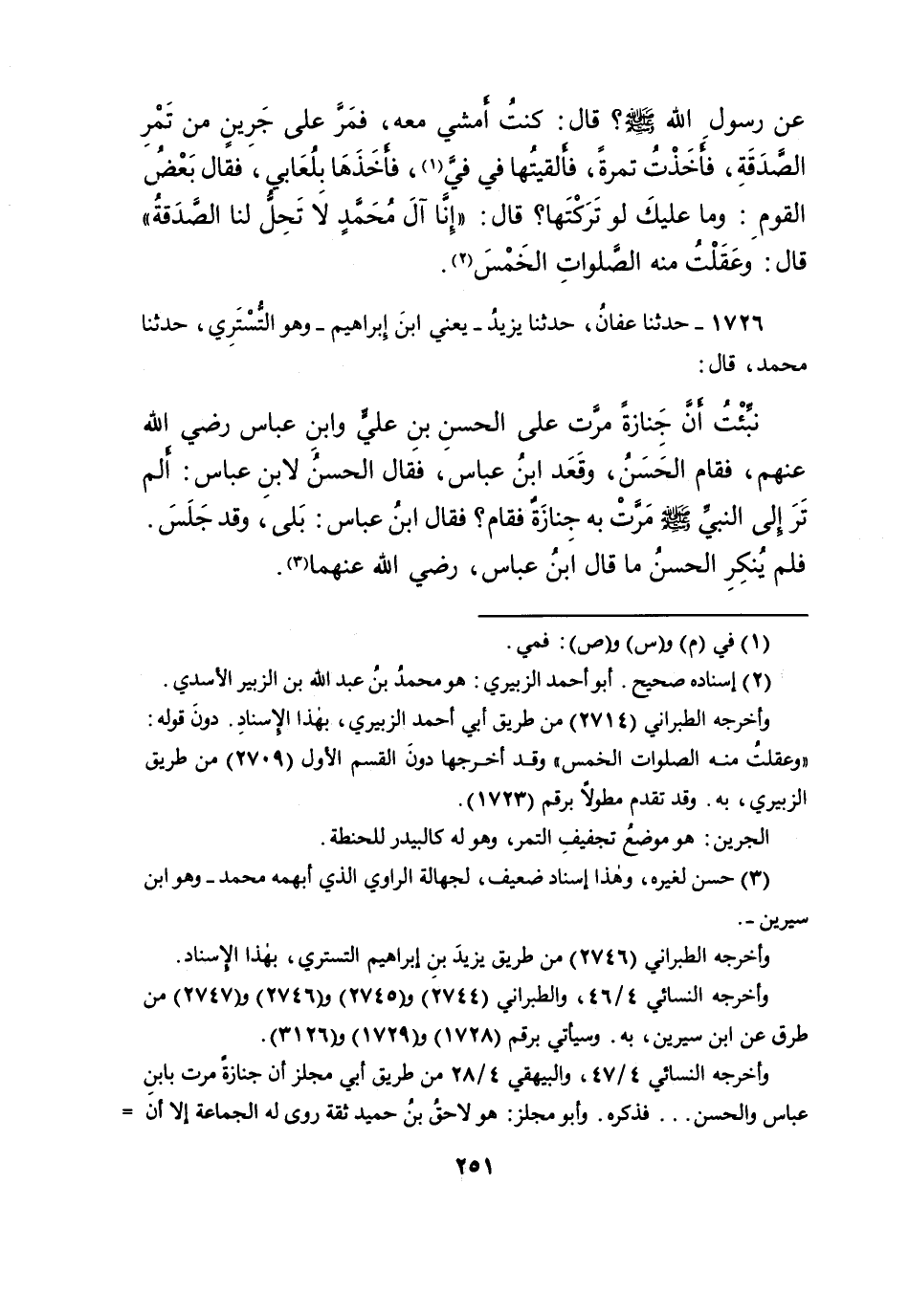 ١٧٢٦ - حَدَّثَنَا عَفَّانُ، حَدَّثَنَا يَزِيدُ يَعْنِي ابْنَ إِبْرَاهِيمَ وَهُوَ التُّسْتَرِيُّ، حَدَّثَنَا مُحَمَّدٌ، قَالَ: نُبِّئْتُ أَنَّ جِنَازَةً مَرَّتْ عَلَى الْحَسَنِ بْنِ عَلِيٍّ، وَابْنِ عَبَّاسٍ، رَضِيَ اللهُ عَنْهُم، فَقَامَ الْحَسَنُ، وَقَعَدَ ابْنُ عَبَّاسٍ، فَقَالَ الْحَسَنُ لِابْنِ عَبَّاسٍ: أَلَمْ تَرَ إِلَى " النَّبِيِّ صَلَّى اللهُ عَلَيْهِ وَسَلَّمَ مَرَّتْ بِهِ جِنَازَةٌ فَقَامَ "، فَقَالَ ابْنُ عَبَّاسٍ: بَلَى، " وَقَدْ جَلَسَ "، فَلَمْ يُنْكِرِ الْحَسَنُ مَا قَالَ ابْنُ عَبَّاسٍ رَضِيَ اللهُ عَنْهُمَا (٣)