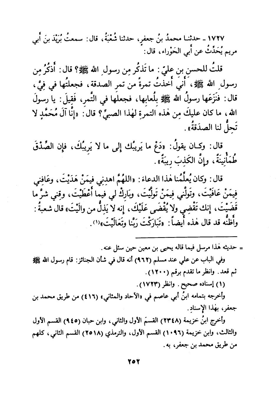 ١٧٢٧ - حَدَّثَنَا مُحَمَّدُ بْنُ جَعْفَرٍ، حَدَّثَنَا شُعْبَةُ، قَالَ: سَمِعْتُ بُرَيْدَ بْنَ أَبِي مَرْيَمَ، يُحَدِّثُ عَنْ أَبِي الْحَوْرَاءِ، قَالَ: قُلْتُ لِلحَسَنِ بْنِ عَلِيٍّ مَا تَذْكُرُ مِنْ رَسُولِ اللهِ صَلَّى اللهُ عَلَيْهِ وَسَلَّمَ؟ قَالَ: أَذْكُرُ مِنْ رَسُولِ اللهِ صَلَّى اللهُ عَلَيْهِ وَسَلَّمَ، أَنِّي أَخَذْتُ تَمْرَةً مِنْ تَمْرِ الصَّدَقَةِ، فَجَعَلْتُهَا فِي فِيَّ، قَالَ: فَنَزَعَهَا رَسُولُ اللهِ صَلَّى اللهُ عَلَيْهِ وَسَلَّمَ بِلُعَابِهَا، فَجَعَلَهَا فِي التَّمْرِ. فَقِيلَ: يَا رَسُولَ اللهِ مَا كَانَ عَلَيْكَ مِنْ هَذِهِ التَّمْرَةِ لِهَذَا الصَّبِيِّ؟ قَالَ: " إِنَّا آلَ مُحَمَّدٍ لَا تَحِلُّ لَنَا الصَّدَقَةُ " قَالَ: وَكَانَ يَقُولُ: " دَعْ مَا يَرِيبُكَ، إِلَى مَا لَا يَرِيبُكَ، فَإِنَّ الصِّدْقَ طُمَأْنِينَةٌ، وَإِنَّ الْكَذِبَ رِيبَةٌ "