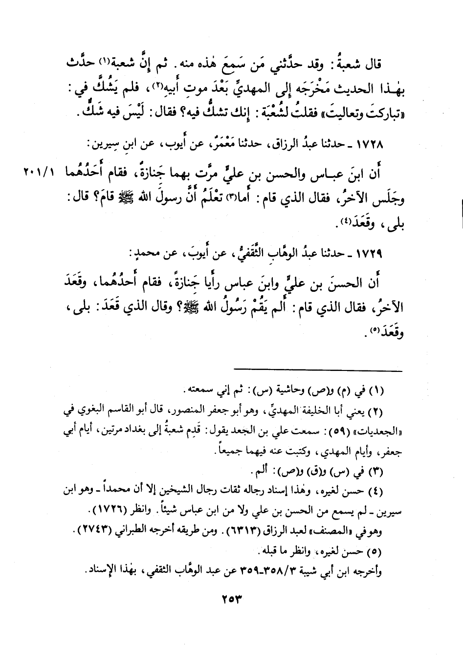 ١٧٢٩ - حَدَّثَنَا عَبْدُ الْوَهَّابِ الثَّقَفِيُّ، عَنْ أَيُّوبَ، عَنْ مُحَمَّدٍ، أَنَّ الْحَسَنَ بْنَ عَلِيٍّ، وَابْنَ عَبَّاسٍ رَأَيَا جَنَازَةً، فَقَامَ أَحَدُهُمَا، وَقَعَدَ الْآخَرُ، فَقَالَ الَّذِي قَامَ: " أَلَمْ يَقُمْ رَسُولُ اللهِ صَلَّى اللهُ عَلَيْهِ وَسَلَّمَ "، وَقَالَ الَّذِي قَعَدَ: " بَلَى، وَقَعَدَ " (٥)