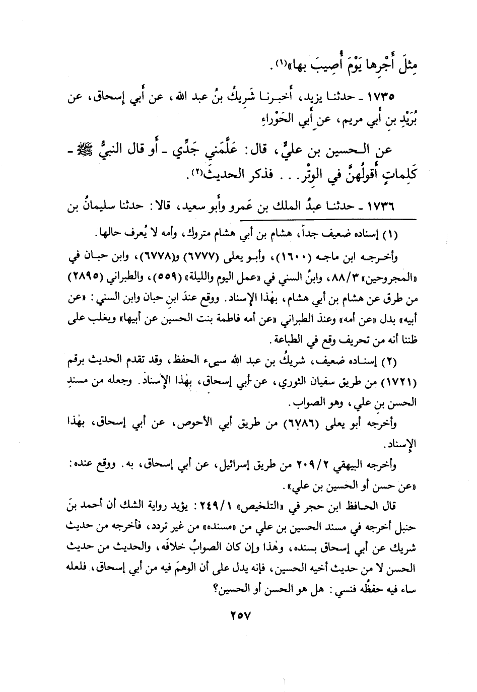 ١٧٣٥ - حَدَّثَنَا يَزِيدُ، أَخْبَرَنَا شَرِيكُ بْنُ عَبْدِ اللهِ، عَنْ أَبِي إِسْحَاقَ، عَنْ بُرَيْدِ بْنِ أَبِي مَرْيَمَ، عَنْ أَبِي الْحَوْرَاءِ، عَنِ الْحُسَيْنِ بْنِ عَلِيٍّ، قَالَ: عَلَّمَنِي جَدِّي - أَوْ قَالَ النَّبِيُّ صَلَّى اللهُ عَلَيْهِ وَسَلَّمَ - كَلِمَاتٍ أَقُولُهُنَّ فِي الْوَتْرِ فَذَكَرَ الْحَدِيثَ (٢)