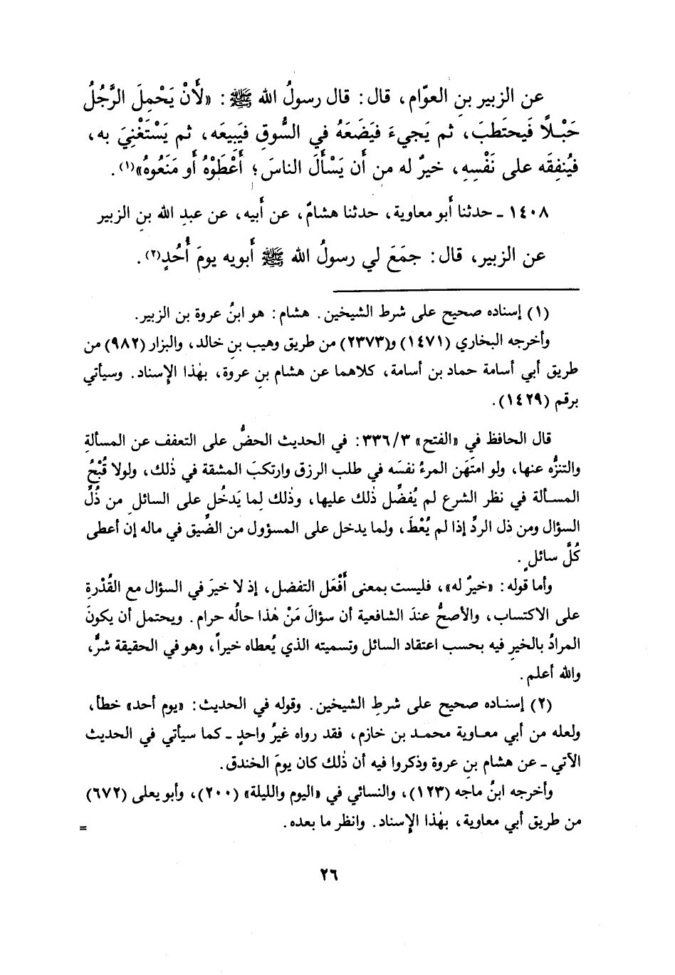 عَنِ الزُّبَيْرِ بْنِ الْعَوَّامِ، قَالَ: قَالَ رَسُولُ اللهِ صَلَّى اللهُ عَلَيْهِ وَسَلَّمَ: " لأنْ يَحْمِلَ الرَّجُلُ حَبْلًا فَيَحْتَطِبَ ثُمَّ يَجِيءَ فَيَضَعَهُ فِي السُّوقِ فَيَبِيعَهُ، ثُمَّ يَسْتَغْنِيَ بِهِ فَيُنْفِقَهُ عَلَى نَفْسِهِ، خَيْرٌ لَهُ مِنْ أَنْ يَسْأَلَ النَّاسَ أَعْطَوْهُ أَوْ مَنَعُوهُ " (١)