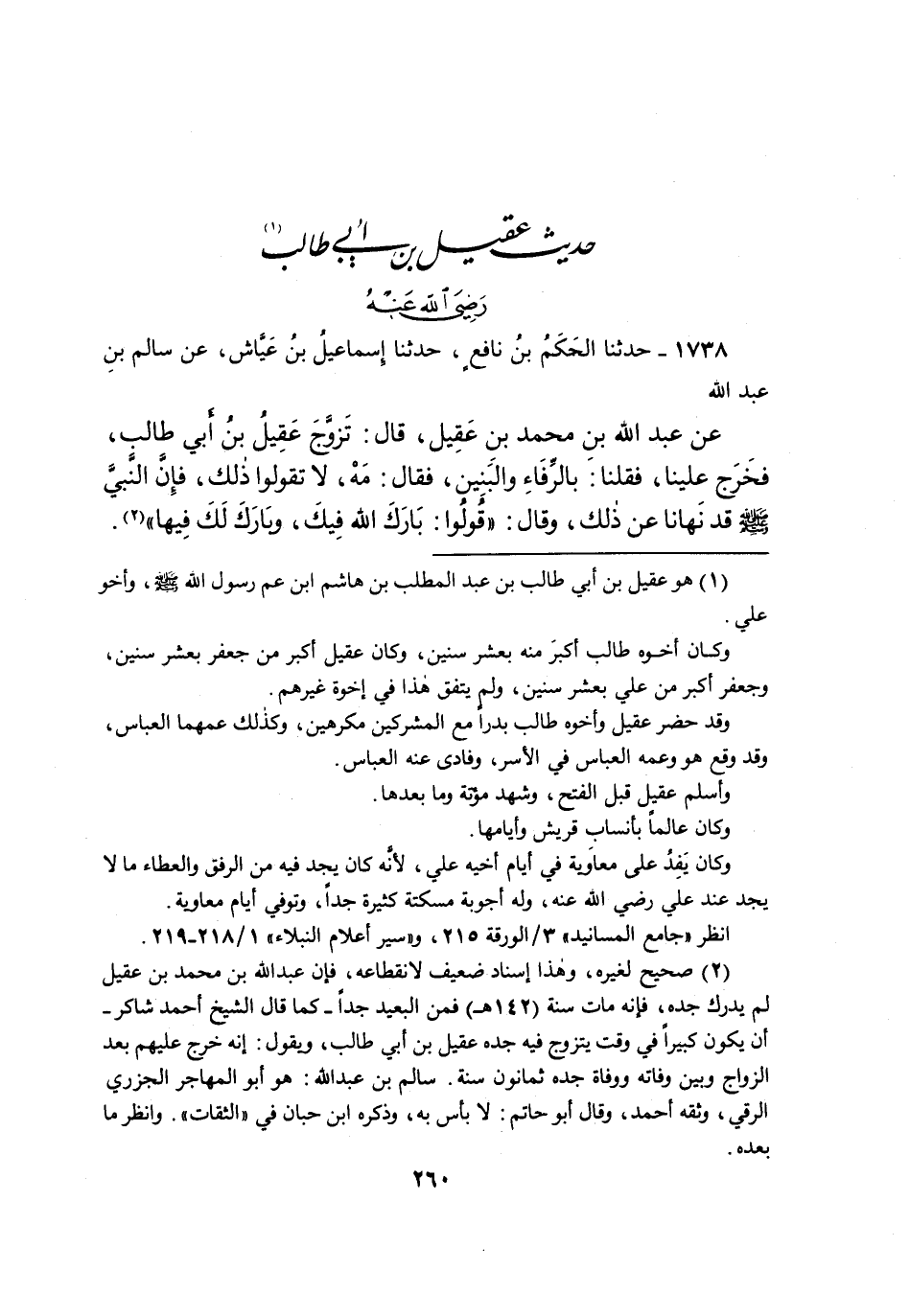 ١٧٣٨ - حَدَّثَنَا الْحَكَمُ بْنُ نَافِعٍ، حَدَّثَنَا إِسْمَاعِيلُ بْنُ عَيَّاشٍ، عَنْ سَالِمِ بْنِ عَبْدِ اللهِ، عَنْ عَبْدِ اللهِ بْنِ مُحَمَّدِ بْنِ عَقِيلٍ، قَالَ: تَزَوَّجَ عَقِيلُ بْنُ أَبِي طَالِبٍ، فَخَرَجَ عَلَيْنَا، فَقُلْنَا بِالرِّفَاءِ وَالْبَنِينَ، فَقَالَ: مَهْ، لَا تَقُولُوا ذَلِكَ، فَإِنَّ النَّبِيَّ صَلَّى اللهُ عَلَيْهِ وَسَلَّمَ قَدْ نَهَانَا عَنْ ذَلِكَ، وَقَالَ: " قُولُوا: بَارَكَ اللهُ فِيكَ، وَبَارَكَ لَكَ فِيهَا " (٢)