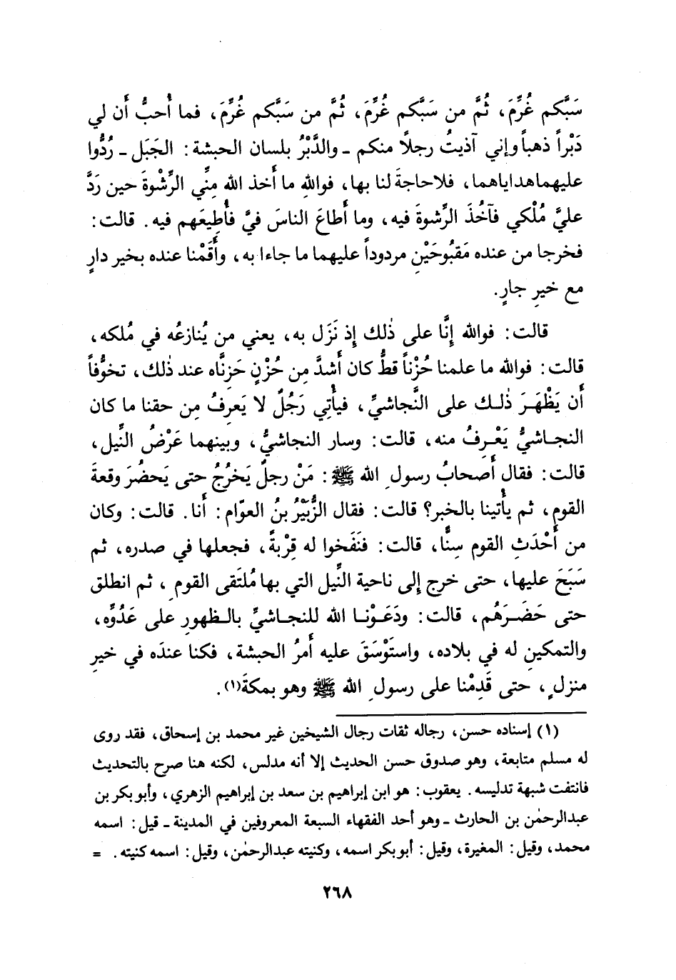 سَبَّكُمْ غُرِّمَ، ثُمَّ مَنْ سَبَّكُمْ غُرِّمَ، فَمَا أُحِبُّ أَنَّ لِي دَبْرًا ذَهَبًا، وَأَنِّي آذَيْتُ رَجُلًا مِنْكُمْ - وَالدَّبْرُ بِلِسَانِ الْحَبَشَةِ: الْجَبَلُ - رُدُّوا عَلَيْهِمَا هَدَايَاهُمَا، فَلا حَاجَةَ لَنَا بِهَا، فَوَاللهِ مَا أَخَذَ اللهُ مِنِّي الرِّشْوَةَ حِينَ رَدَّ عَلَيَّ مُلْكِي، فَآخُذَ الرِّشْوَةَ فِيهِ وَمَا أَطَاعَ النَّاسَ فِيَّ، فَأُطِيعَهُمْ فِيهِ. قَالَتْ: فَخَرَجَا مِنْ عِنْدِهِ مَقْبُوحَيْنِ مَرْدُودًا عَلَيْهِمَا مَا جَاءَا بِهِ، وَأَقَمْنَا عِنْدَهُ بِخَيْرِ دَارٍ مَعَ خَيْرِ جَارٍ. قَالَتْ: فَوَاللهِ إِنَّا عَلَى ذَلِكَ إِذْ نَزَلَ بِهِ - يَعْنِي مَنْ يُنَازِعُهُ فِي مُلْكِهِ - قَالَ: فَوَاللهِ مَا عَلِمْنَا حُزْنًا قَطُّ كَانَ أَشَدَّ مِنْ حُزْنٍ حَزِنَّاهُ عِنْدَ ذَلِكَ، تَخَوُّفًا أَنْ يَظْهَرَ ذَلِكَ عَلَى النَّجَاشِيِّ، فَيَأْتِيَ رَجُلٌ لَا يَعْرِفُ مِنْ حَقِّنَا مَا كَانَ النَّجَاشِيُّ يَعْرِفُ مِنْهُ. قَالَتْ: وَسَارَ النَّجَاشِيُّ وَبَيْنَهُمَا عُرْضُ النِّيلِ، قَالَتْ: فَقَالَ أَصْحَابُ رَسُولِ اللهِ صَلَّى اللهُ عَلَيْهِ وَسَلَّمَ: مَنْ رَجُلٌ يَخْرُجُ حَتَّى يَحْضُرَ وَقْعَةَ الْقَوْمِ ثُمَّ يَأْتِيَنَا بِالْخَبَرِ؟ قَالَتْ: فَقَالَ الزُّبَيْرُ بْنُ الْعَوَّامِ: أَنَا، قَالَتْ: وَكَانَ مِنْ أَحْدَثِ الْقَوْمِ سِنًّا، قَالَتْ: فَنَفَخُوا لَهُ قِرْبَةً، فَجَعَلَهَا فِي صَدْرِهِ ثُمَّ سَبَحَ عَلَيْهَا حَتَّى خَرَجَ إِلَى نَاحِيَةِ النِّيلِ الَّتِي بِهَا مُلْتَقَى الْقَوْمِ، ثُمَّ انْطَلَقَ حَتَّى حَضَرَهُمْ. قَالَتْ: وَدَعَوْنَا اللهَ لِلنَّجَاشِيِّ بِالظُّهُورِ عَلَى عَدُوِّهِ، وَالتَّمْكِينِ لَهُ فِي بِلادِهِ، وَاسْتَوْسَقَ عَلَيْهِ أَمْرُ الْحَبَشَةِ، فَكُنَّا عِنْدَهُ فِي خَيْرِ مَنْزِلٍ، حَتَّى قَدِمْنَا عَلَى رَسُولِ اللهِ صَلَّى اللهُ عَلَيْهِ وَسَلَّمَ، وَهُوَ بِمَكَّةَ (١)