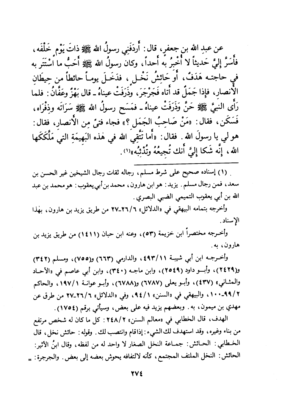 عَنْ عَبْدِ اللهِ بْنِ جَعْفَرٍ، قَالَ: أَرْدَفَنِي رَسُولُ اللهِ صَلَّى اللهُ عَلَيْهِ وَسَلَّمَ، ذَاتَ يَوْمٍ خَلْفَهُ، فَأَسَرَّ إِلَيَّ حَدِيثًا لَا أُخْبِرُ بِهِ أَحَدًا وَكَانَ رَسُولُ اللهِ صَلَّى اللهُ عَلَيْهِ وَسَلَّمَ أَحَبُّ مَا اسْتَتَرَ بِهِ فِي حَاجَتِهِ هَدَفٌ، أَوْ حَائِشُ نَخْلٍ، فَدَخَلَ يَوْمًا حَائِطًا مِنْ حِيطَانِ الْأَنْصَارِ، فَإِذَا جَمَلٌ قَدِ أتَاهُ فَجَرْجَرَ، وَذَرَفَتْ عَيْنَاهُ - قَالَ بَهْزٌ، وَعَفَّانُ: فَلَمَّا رَأَى النَّبِيَّ صَلَّى اللهُ عَلَيْهِ وَسَلَّمَ حَنَّ وَذَرَفَتْ عَيْنَاهُ - فَمَسَحَ رَسُولُ اللهِ صَلَّى اللهُ عَلَيْهِ وَسَلَّمَ سَرَاتَهُ وَذِفْرَاهُ، فَسَكَنَ، فَقَالَ: " مَنْ صَاحِبُ الْجَمَلِ؟ " فَجَاءَ فَتًى مِنَ الْأَنْصَارِ، فَقَالَ: هُوَ لِي يَا رَسُولَ اللهِ، فَقَالَ: " أَمَا تَتَّقِي اللهَ فِي هَذِهِ الْبَهِيمَةِ الَّتِي مَلَّكَكَهَا اللهُ، إِنَّهُ شَكَا إِلَيَّ أَنَّكَ تُجِيعُهُ وَتُدْئِبُهُ " (١)
