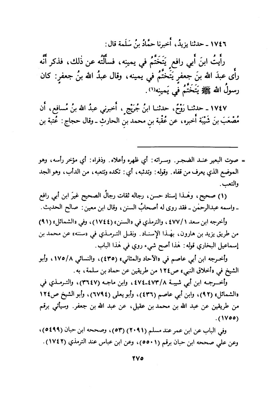 ١٧٤٦ - حَدَّثَنَا يَزِيدُ، أَخْبَرَنَا حَمَّادُ بْنُ سَلَمَةَ، قَالَ: رَأَيْتُ ابْنَ أَبِي رَافِعٍ يَتَخَتَّمُ فِي يَمِينِهِ، فَسَأَلْتُهُ عَنْ ذَلِكَ، فَذَكَرَ أَنَّهُ رَأَى عَبْدَ اللهِ بْنَ جَعْفَرٍ يَتَخَتَّمُ فِي يَمِينِهِ. وَقَالَ عَبْدُ اللهِ بْنُ جَعْفَرٍ: " كَانَ رَسُولُ اللهِ صَلَّى اللهُ عَلَيْهِ وَسَلَّمَ، يَتَخَتَّمُ فِي يَمِينِهِ " (١)