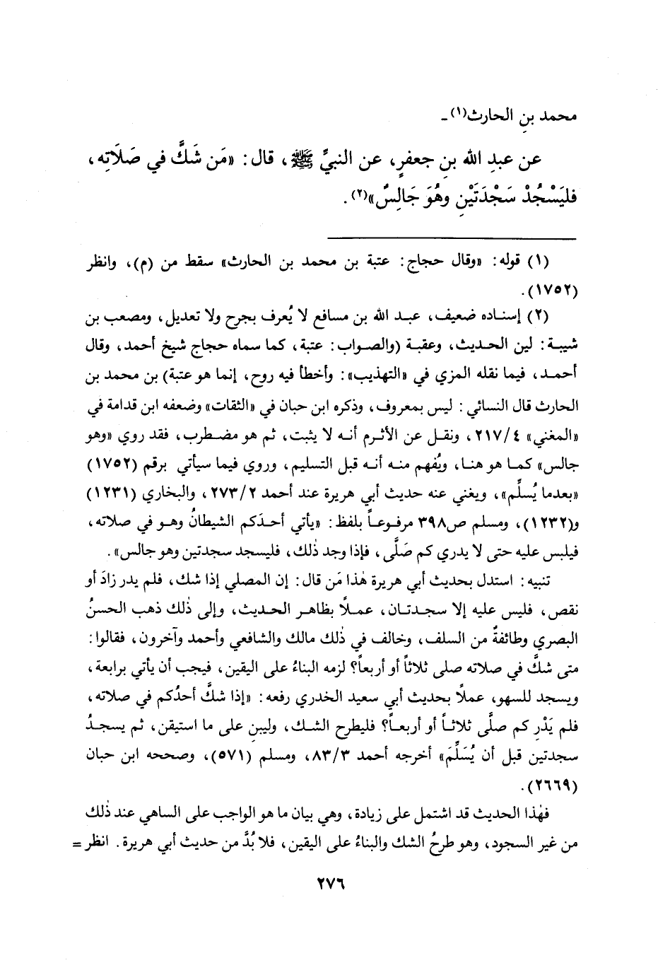 مُحَمَّدِ بْنِ الْحَارِثِ (١) ، عَنْ عَبْدِ اللهِ بْنِ جَعْفَرٍ، عَنِ النَّبِيِّ صَلَّى اللهُ عَلَيْهِ وَسَلَّمَ، قَالَ: " مَنْ شَكَّ فِي صَلاتِهِ، فَلْيَسْجُدْ سَجْدَتَيْنِ وَهُوَ جَالِسٌ " (٢)