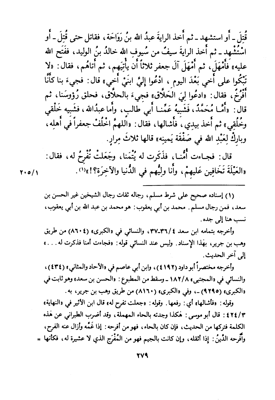قُتِلَ - أَوِ اسْتُشْهِدَ -، ثُمَّ أَخَذَ الرَّايَةَ عَبْدُ اللهِ بْنُ رَوَاحَةَ، فَقَاتَلَ حَتَّى قُتِلَ - أَوِ اسْتُشْهِدَ - ثُمَّ أَخَذَ الرَّايَةَ سَيْفٌ مِنْ سُيُوفِ اللهِ خَالِدُ بْنُ الْوَلِيدِ، فَفَتَحَ اللهُ عَلَيْهِ " فَأَمْهَلَ، ثُمَّ أَمْهَلَ آلَ جَعْفَرٍ - ثَلاثًا - أَنْ يَأْتِيَهُمْ، ثُمَّ أَتَاهُمْ فَقَالَ: " لَا تَبْكُوا عَلَى أَخِي بَعْدَ الْيَوْمِ ادْعُوا إلِي ابْنَيِ أخِي " قَالَ: فَجِيءَ بِنَا كَأَنَّا أَفْرُخٌ، فَقَالَ: ادْعُوا إِلَيَّ الْحَلاقَ، فَجِيءَ بِالْحَلاقِ فَحَلَقَ رُءُوسَنَا، ثُمَّ قَالَ: " أَمَّا مُحَمَّدٌ فَشَبِيهُ عَمِّنَا أَبِي طَالِبٍ، وَأَمَّا عَبْدُ اللهِ فَشَبِيهُ خَلْقِي وَخُلُقِي " ثُمَّ أَخَذَ بِيَدِي فَأَشَالَهَا، فَقَالَ: " اللهُمَّ اخْلُفْ جَعْفَرًا فِي أَهْلِهِ، وَبَارِكْ لِعَبْدِ اللهِ فِي صَفْقَةِ يَمِينِهِ "، قَالَهَا ثَلاثَ مِرَارٍ، قَالَ: فَجَاءَتِ أمُّنَا فَذَكَرَتْ لَهُ يُتْمَنَا، وَجَعَلَتْ تُفْرِحُ لَهُ، فَقَالَ: " الْعَيْلَةَ تَخَافِينَ عَلَيْهِمْ وَأَنَا وَلِيُّهُمْ فِي الدُّنْيَا وَالْآخِرَةِ؟! " (١)