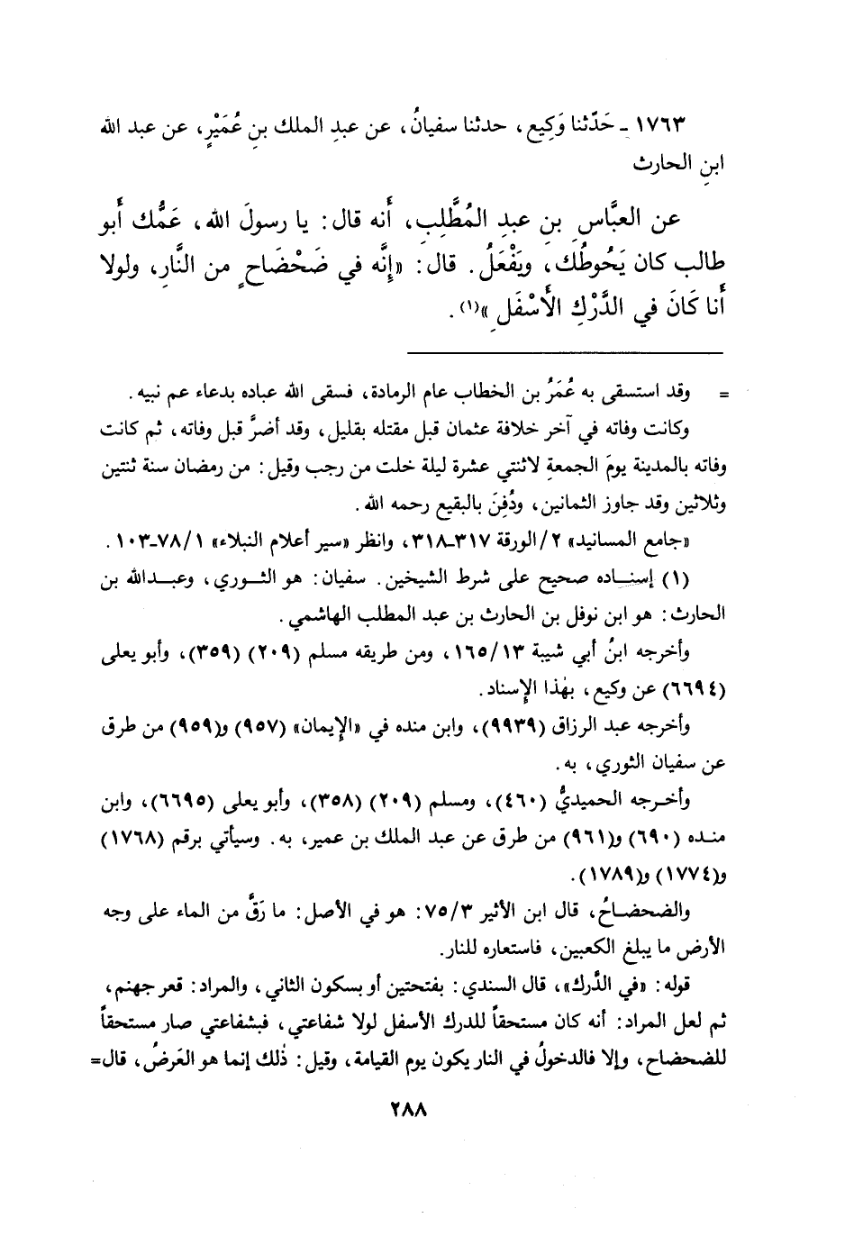 ١٧٦٣ - حَدَّثَنَا وَكِيعٌ، حَدَّثَنَا سُفْيَانُ، عَنْ عَبْدِ الْمَلِكِ بْنِ عُمَيْرٍ، عَنْ عَبْدِ اللهِ بْنِ الْحَارِثِ، عَنِ الْعَبَّاسِ بْنِ عَبْدِ الْمُطَّلِبِ، أَنَّهُ قَالَ: يَا رَسُولَ اللهِ، عَمُّكَ أَبُو طَالِبٍ كَانَ يَحُوطُكَ وَيَنْفَعُكَ، قَالَ: " إِنَّهُ فِي ضَحْضَاحٍ مِنَ النَّارِ، وَلَوْلا أَنَا كَانَ فِي الدَّرْكِ الْأَسْفَلِ " (١)