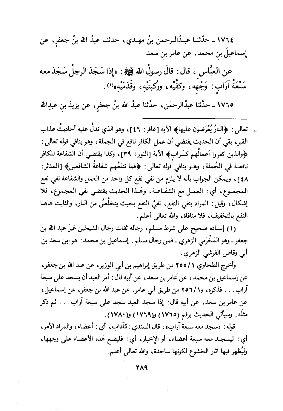 وأخرج الطحاوي ١/٢٥٥ من طريق إبراهيم بن أبي الوزير، عن عبد الله بن جعفر، عن إسماعيل بن محمد، عن عامر بن سعد، عن أبيه قال: أمر العبد أن يسجد على سبعة آراب ... فذكره، و١/٢٥٦ من طريق أبي عامر، عن عبد الله بن جعفر، عن إسماعيل، عن عامر بن سعد، عن أبيه قال: إذا سجد العبد سجد على سبعة آراب ... ثم ذكر مثلَه. وسيأتي الحديث برقم (١٧٦٥) و (١٧٦٩) و (١٧٨٠) .