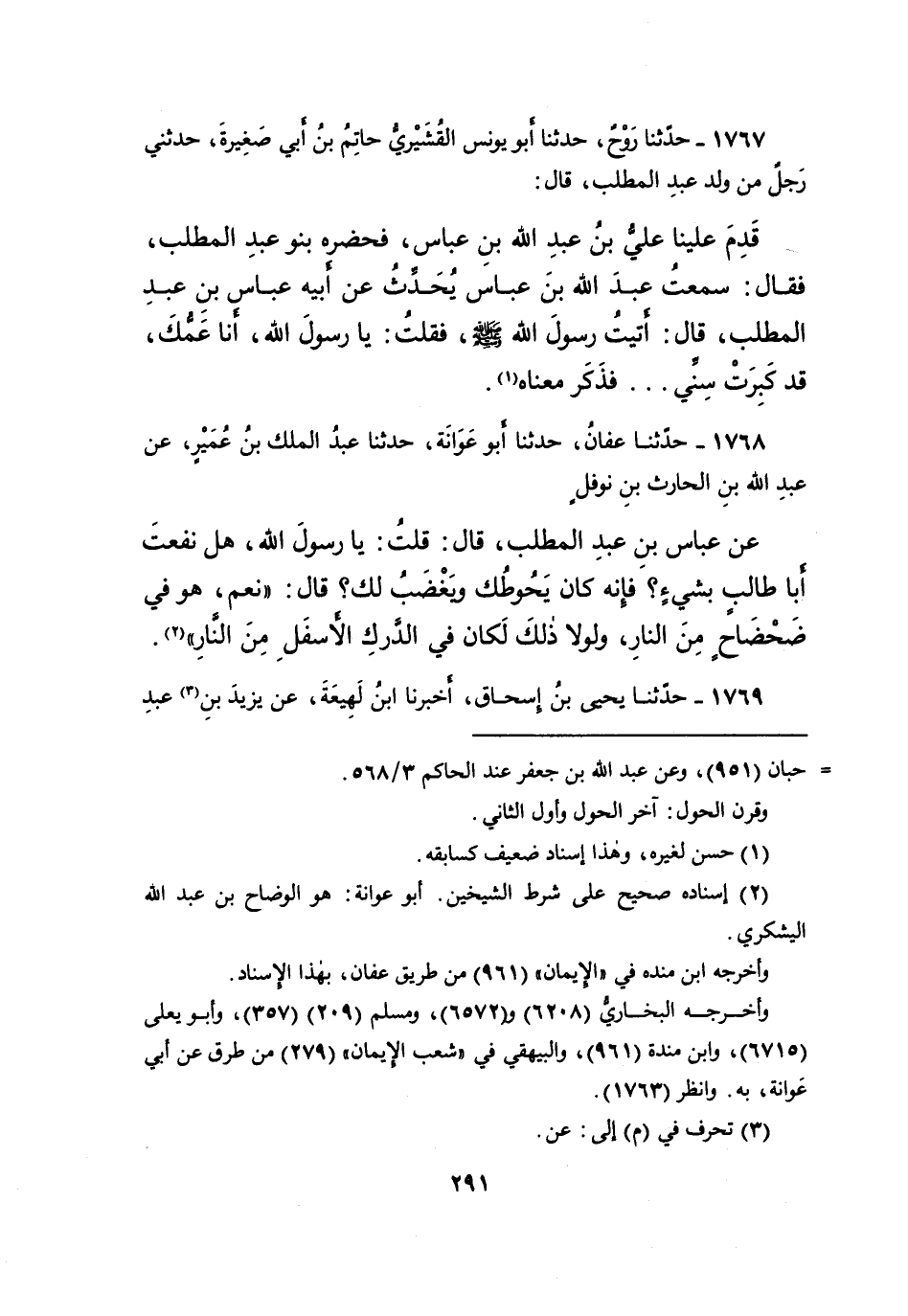 ١٧٦٨ - حَدَّثَنَا عَفَّانُ، حَدَّثَنَا أَبُو عَوَانَةَ، حَدَّثَنَا عَبْدُ الْمَلِكِ بْنُ عُمَيْرٍ، عَنْ عَبْدِ اللهِ بْنِ الْحَارِثِ بْنِ نَوْفَلٍ، عَنْ عَبَّاسِ بْنِ عَبْدِ الْمُطَّلِبِ، قَالَ: قُلْتُ: يَا رَسُولَ اللهِ، هَلْ نَفَعْتَ أَبَا طَالِبٍ بِشَيْءٍ، فَإِنَّهُ كَانَ يَحُوطُكَ، وَيَغْضَبُ لَكَ، قَالَ: " نَعَمْ، هُوَ فِي ضَحْضَاحٍ مِنَ النَّارِ، وَلَوْلا ذَلِكَ لَكَانَ فِي الدَّرْكِ الْأَسْفَلِ مِنَ النَّارِ " (٢)